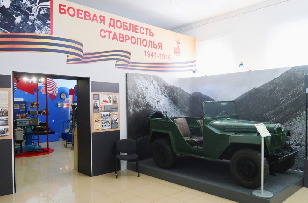 Выставка «Боевая доблесть Ставрополья» посвящена событиям Великой Отечественной войны (1941-1945). Здесь представлено множество уникальных экспонатов: мундиры, солдатские реликвии, фронтовые письма, воспоминания, фотографии, документы, награды, обмундирование, вооружение, боевые знамена, военные трофеи и многое другое.