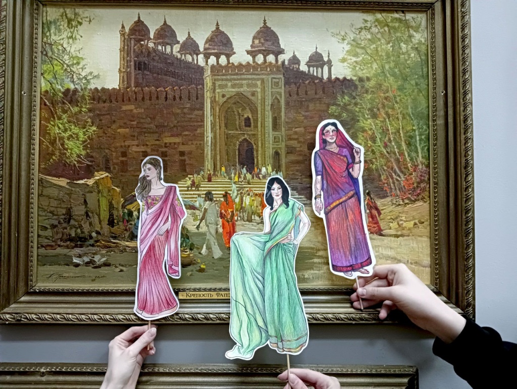 Почувствовать атмосферу этой далекой и красочной страны помогла этническая музыка и особое творческое задание: примерить на себя сари, созданное из предложенных материалов. В завершении мероприятия участники создали на память бумажную игрушку-сувенир «Индианка».