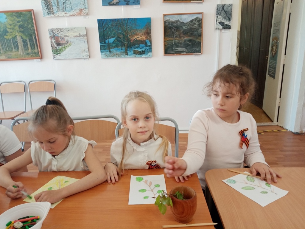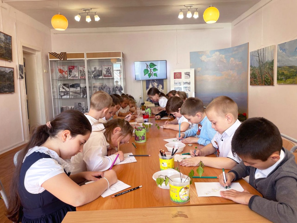 Ребята познакомились с пейзажем «Весна в Татарке» местного художника, участника СВО А.К. Шишугина. Затем сотрудники музея представили тематическое слайд-шоу и рассказали детям о березе. С давних времен береза считается символом России. Участников мероприятия познакомили с этимологией слова «береза», рассказали, что долгие годы дерево было символом плодородия и здоровья, а затем его стали ассоциировать с девичьей красой и женским началом.