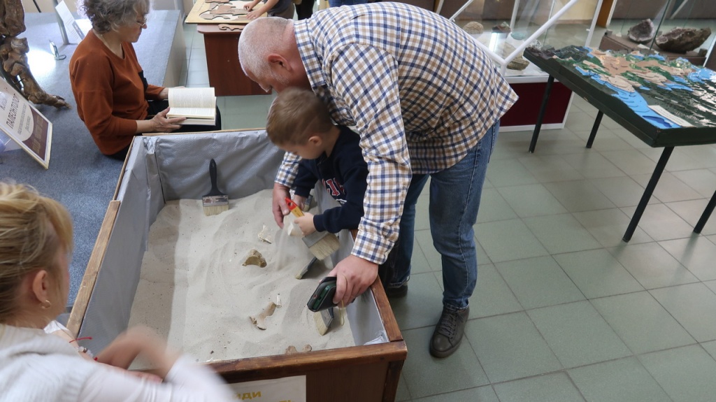 Совместно с лаборантом Л.В. Минченко гости музея приняли участие в имитации палеонтологических раскопок, пытаясь найти в песке «золотую кость». Каждый, кто обнаружил такую находку, получил именную грамоту с печатью южного слона или эласмотерия.