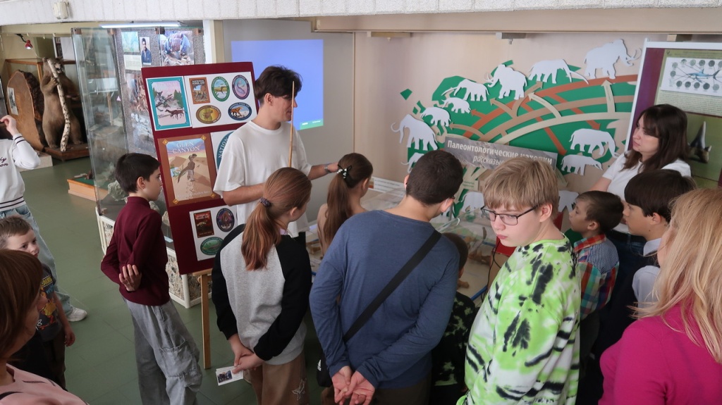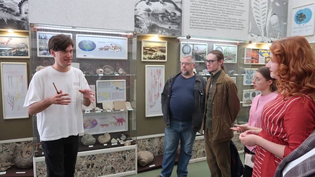 Научный сотрудник музея, палеонтолог В.В. Волокитин провел экскурсию для участников проекта «Расту в музее и для группы студентов биологического факультета СКФУ, где рассказал о том, что представляют собой фоссилии, и как они образуются. Затем посетители узнали о символах Дня фоссилий и прослушали лекцию об эволюции древних животных на территории современного Предкавказья на примере экспонатов из зала палеонтологии музея. В ходе мероприятия экскурсанты смогли увидеть 3D-объекты зубов южных слонов и фрагменты скелета носорога эласмотерия сибирского. Также посетители ознакомились с новой выставкой «Уникальный микромир ископаемых акул».