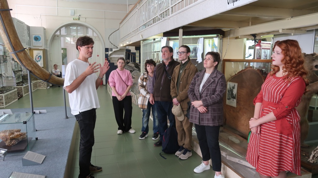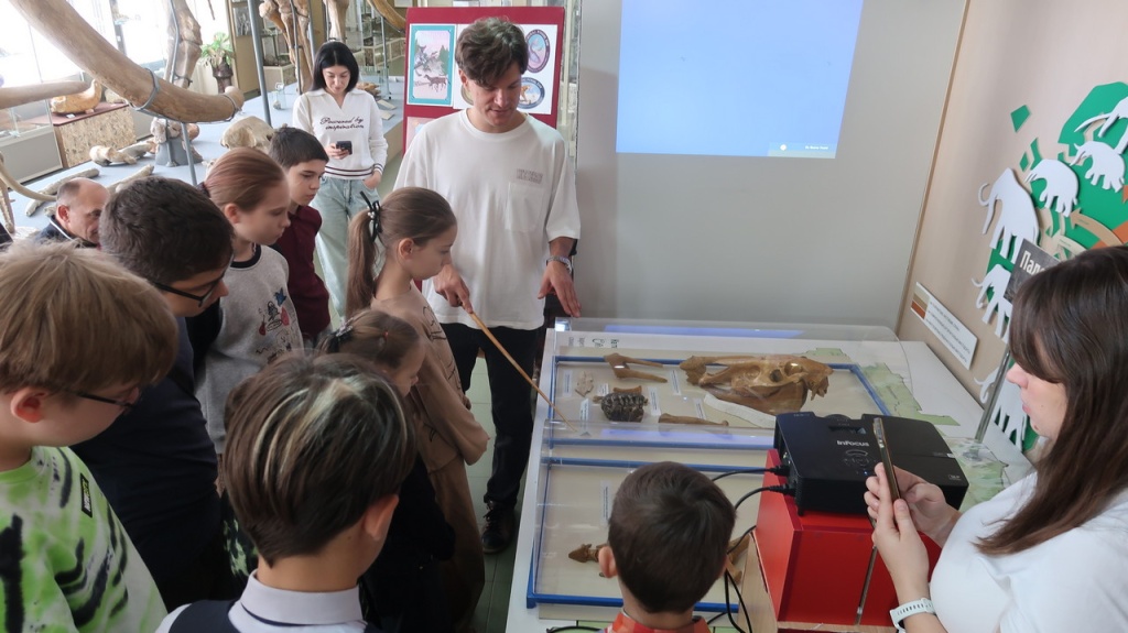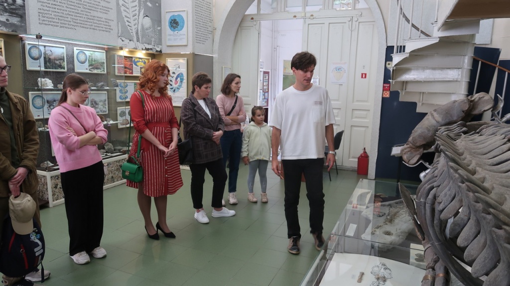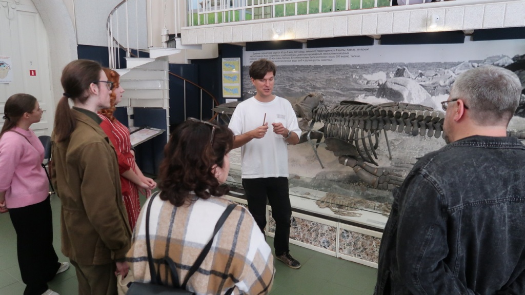 В импровизированной «лаборатории палеонтолога» научные сотрудники Н.Р. Кочнева и В.В. Волокитин ознакомили юных натуралистов и студентов-биологов с приемами камеральной обработки на примере сарматского кита, древних наземных млекопитающих, моллюсков, растений и других ископаемых остатков. Участники самостоятельно провели замеры штангенциркулем и рулеткой, попробовали собрать фрагмент скелета кита, словно палеонтологический пазл. Отдельно каждый экскурсант рассмотрел в бинокуляре раковины моллюсков и мельчайшие ископаемые организмы, позволяющие установить относительный возраст фоссилий.