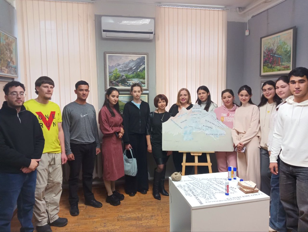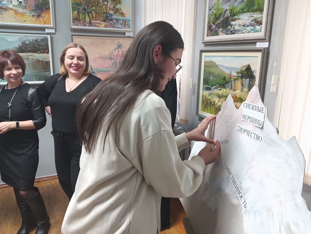 Для зрителей прошла тематическая экскурсия, посвященная теме гор в живописи П.М. Гречишкина, а также знакомство с выставкой Марины Мурчич «Новые горизонты». Студенты, изучающие русский язык, приняли участие в составлении «Облака слов» на стилизованном макете гор, а также расписали гирлянду разноцветных флажков, которые часто можно встретить в горах, особенно в Гималаях.