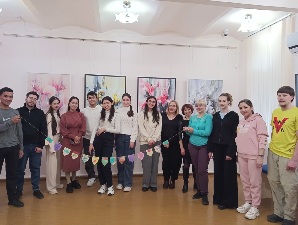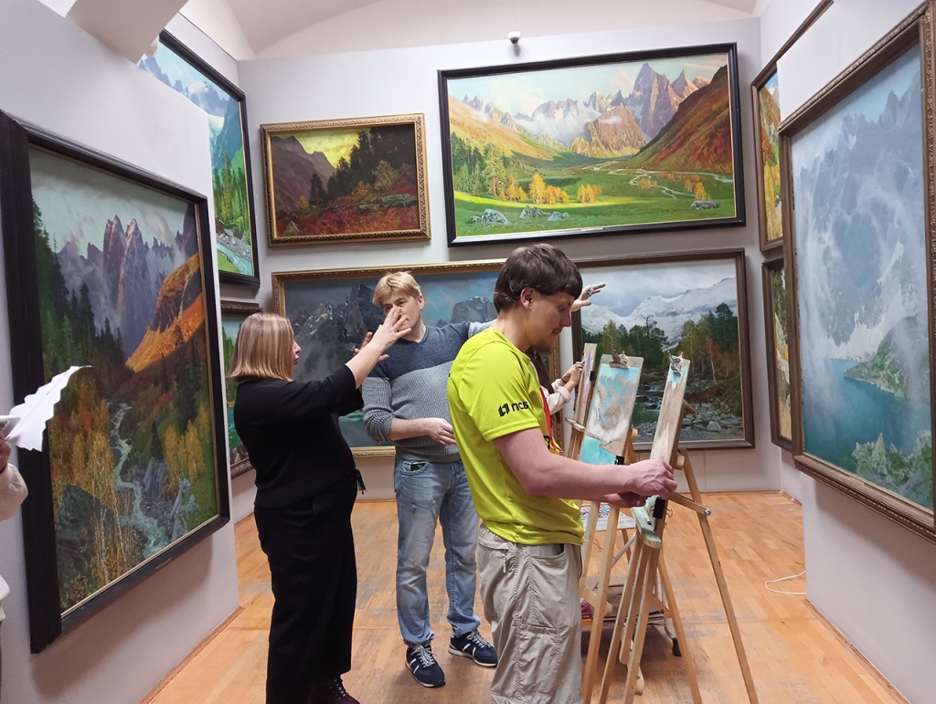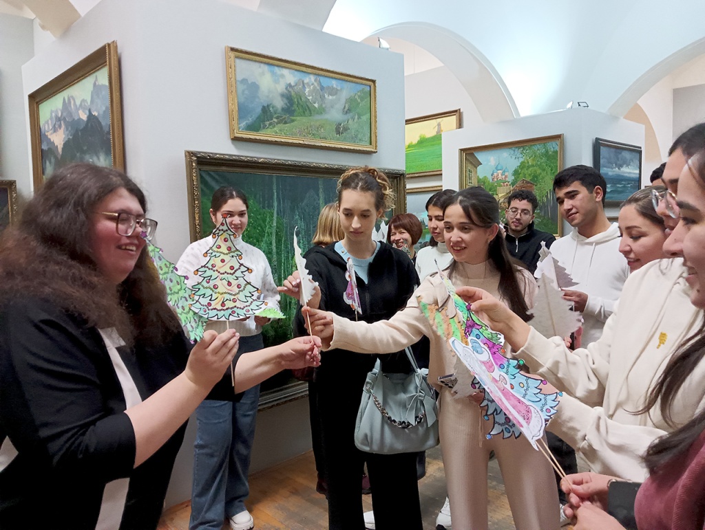 Сотрудники галереи поздравили участников с наступающими новогодними праздниками, вручив расписные игрушки-ёлочки, Деда Мороза и Снегурочку. В рамках языковой практики участники исполнили одну из главных новогодних песен, а также попробовали свои силы в художественном копировании картины Павла Моисеевича Гречишкина «Озеро в облаках» 1981 года.