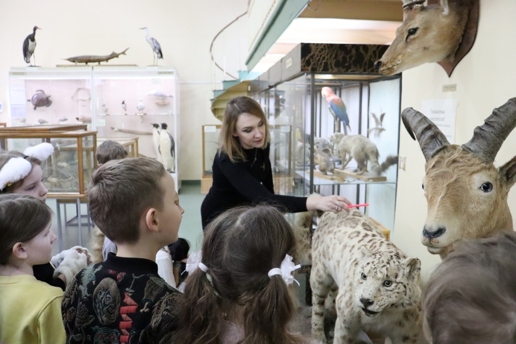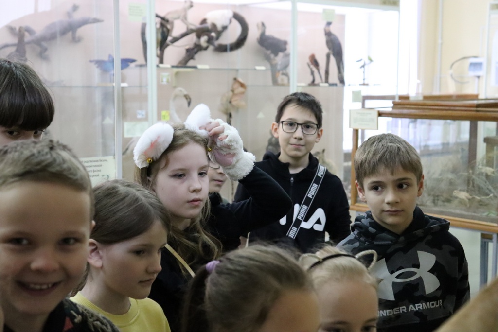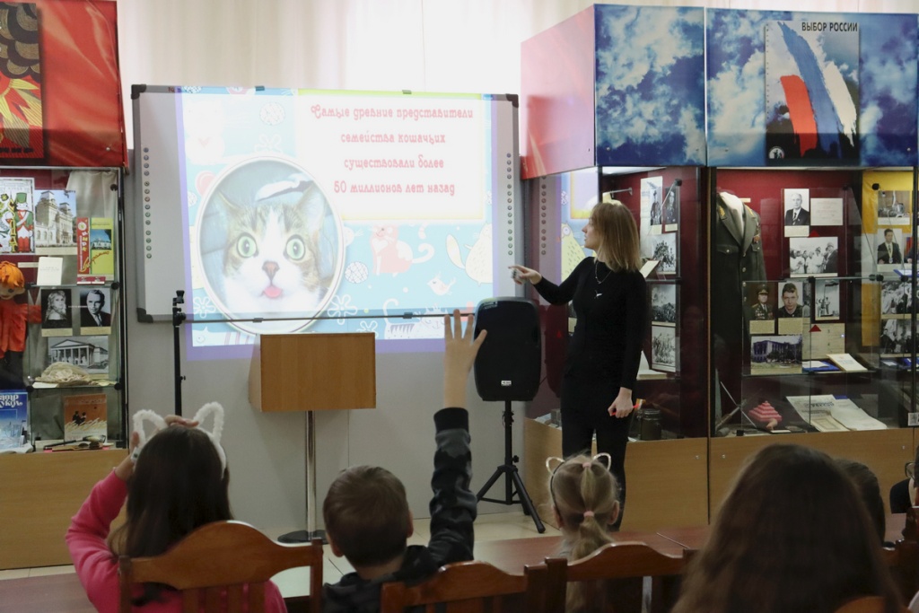Детей ожидала экскурсия «В семействе кошачьих», в ходе которой экскурсовод рассказал о разных видах кошек, их особенностях и уникальной адаптации. Участники смогли узнать много интересного о дикой и домашней жизни этих животных. Мало кто знает, но наука, изучающая кошек, называется фелинологией. В настоящий момент в современном мире фелинологи насчитывают более 250 пород кошек (из них официально признаны федерациями 70), и благодаря селекции это количество постоянно растет. Но как же появилась первая домашняя кошка?