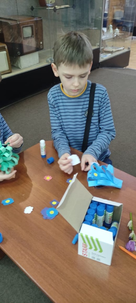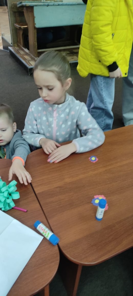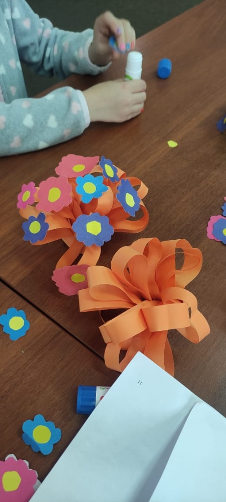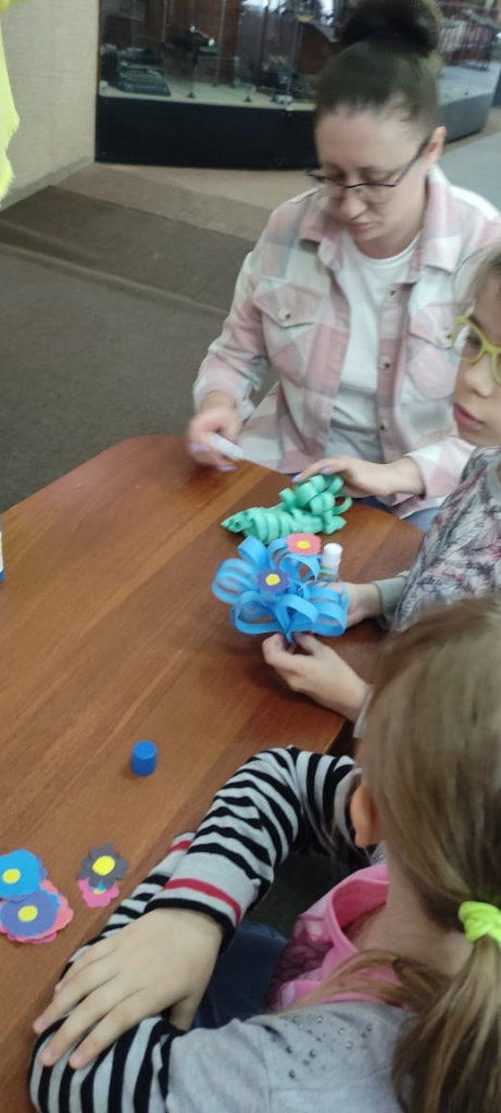 Волонтеры Всероссийского добровольческого проекта «Дети-детям» помогали ребятам на мастер-классе «Подарочки для мамочки». Дети мастерили букеты из бумаги и картона в подарок своим мамам.