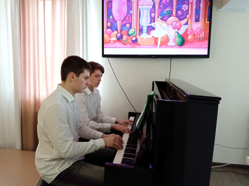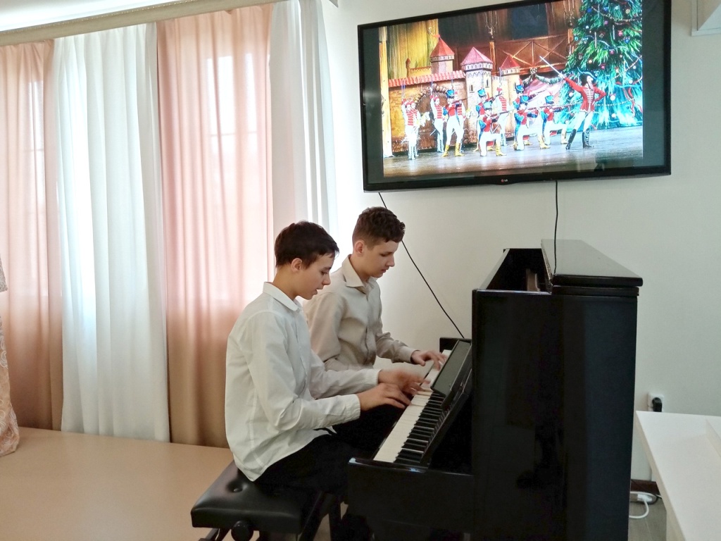 Далее в переложении для фортепиано прозвучали номера из балета П.И. Чайковского «Щелкунчик»: «Марш» (исполнители Андросов Олег и Машинин Матвей), «Трепак» (семейный ансамбль преподавателя ДШИ М.Я. Паниной и выпускника ДШИ Панина Николая), «Танец феи Драже» (лучшие ученики Е.В. Митенко Белоусов Илья и Панин Николай в ансамбле).