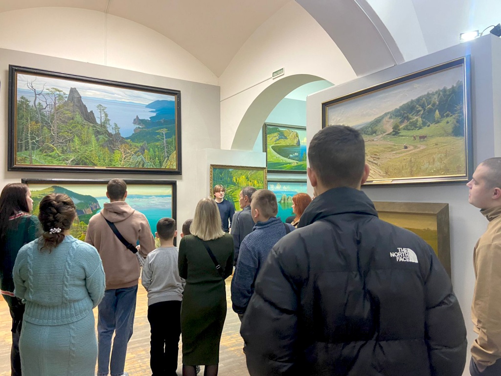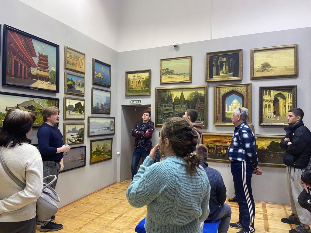 В рамках обзорной экскурсии Андрей Владимирович рассказал о памятниках русского деревянного зодчества на примере пейзажей Русского Севера, показал многообразие таежной природы озера Байкал в живописи Гречишкина. Завершилась экскурсия посещением зарубежного зала и знакомством с урбанистическими пейзажами Италии, Индии, Непала, Мексики, Египта, Японии, Турции и Франции.
