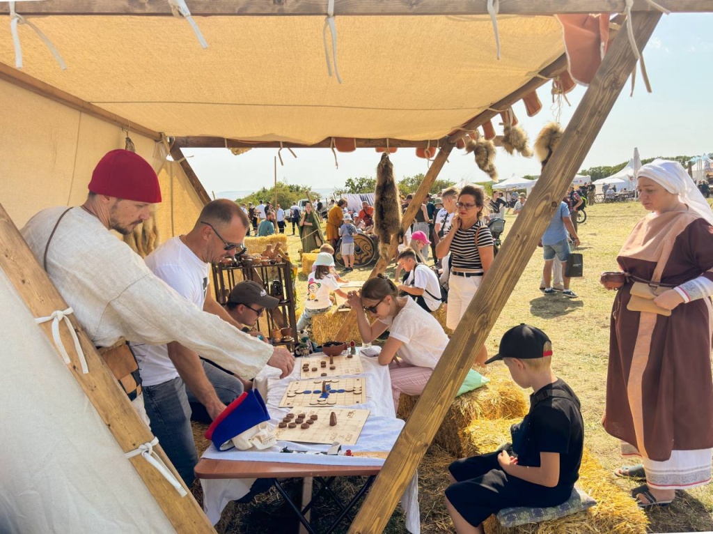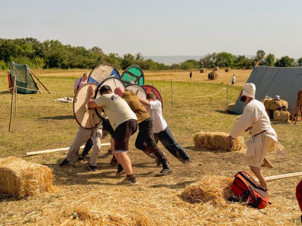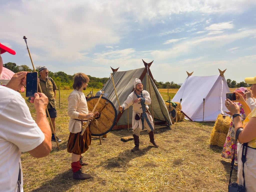 Реконструкторы из Краснодара представили несколько площадок, посвященных раннесредневековым славянам и скандинавам. Здесь можно было посоревноваться в рубке глины мечом, увидеть выставку воинского снаряжения, принять участие в мастер-классе по набивке на ткани и создать свою древнюю монету, отчеканив ее ударом молотка.