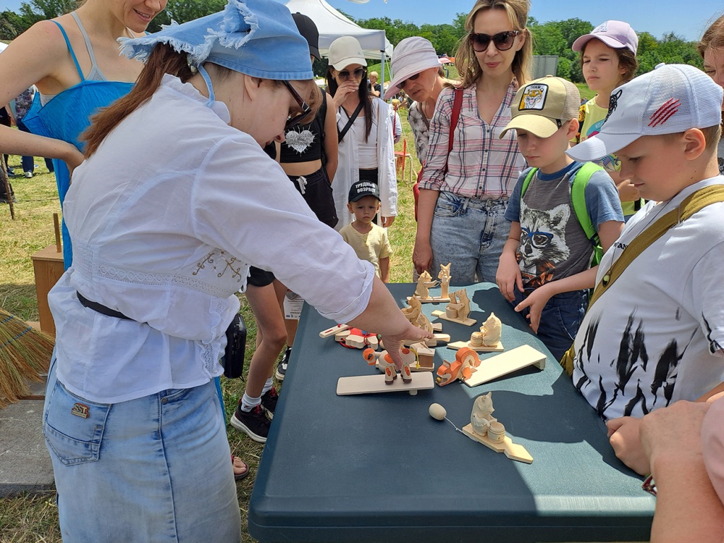 В ходе сюжетно-интеллектуальной игры «Кукольный сказ: от лоскутка к истории» и мастер-класса «Кукла-кувадка» все желающие узнали много интересного из истории народной игрушки и смогли создать ее собственными руками. На локации «Искусство движения в дереве» гости фестиваля познакомились с богородской деревянной динамической игрушкой, а на площадке «Этнографические загадки» – с предметами быта из этнографической коллекции музея: коромыслом, рубелем, чугунком, каталкой, старинным утюгом, веретеном, маслобойкой.