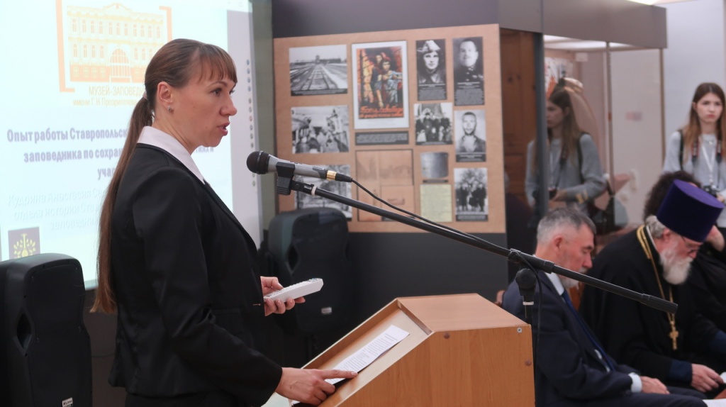 Старший научный сотрудник отдела истории Ставропольского государственного музея-заповедника, кандидат философских наук А.С. Кудрина в своем докладе поделилась опытом работы музея по сохранению памяти о событиях и участниках специальной военной операции.