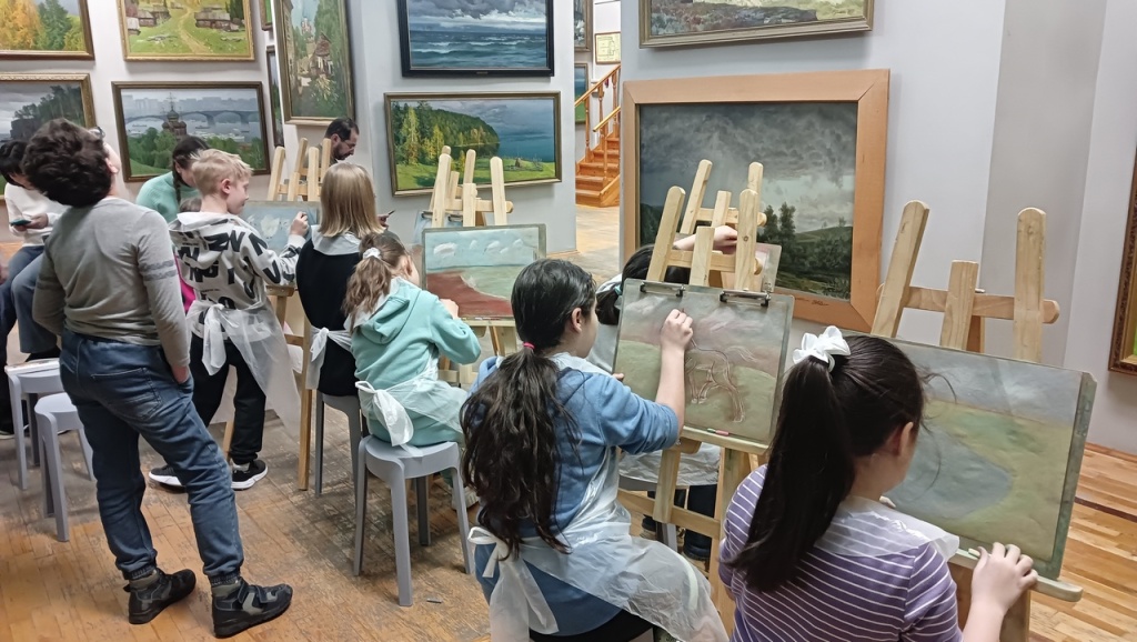 Далее ребята познакомились уже с классикой советского реалистического пейзажа в исполнении мастера Павла Моисеевича Гречишкина. Младший научный сотрудник Шевцов Андрей Владимирович показал мастер-класс по созданию быстрой зарисовки по мотивам пейзажа 1960 года «Озеро Маныч». После ребята приступили к созданию своих собственных зарисовок.