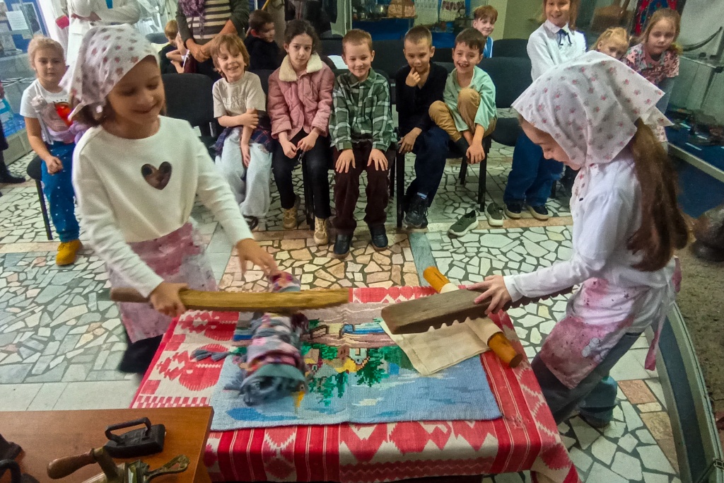 Ребята с удовольствием окунулись в атмосферу прошлого и с азартом принялись катать белье рубелем и утюжить цельнометаллическим утюгом. Не забыли обсудить способы изготовления, вес утюгов и способы глажки разной ткани.