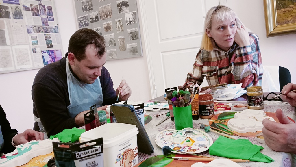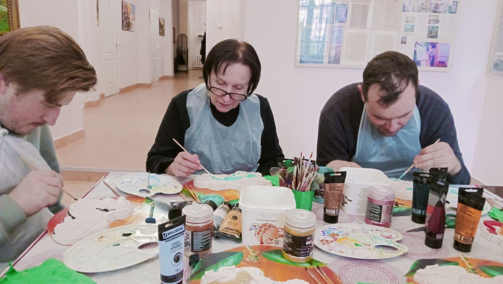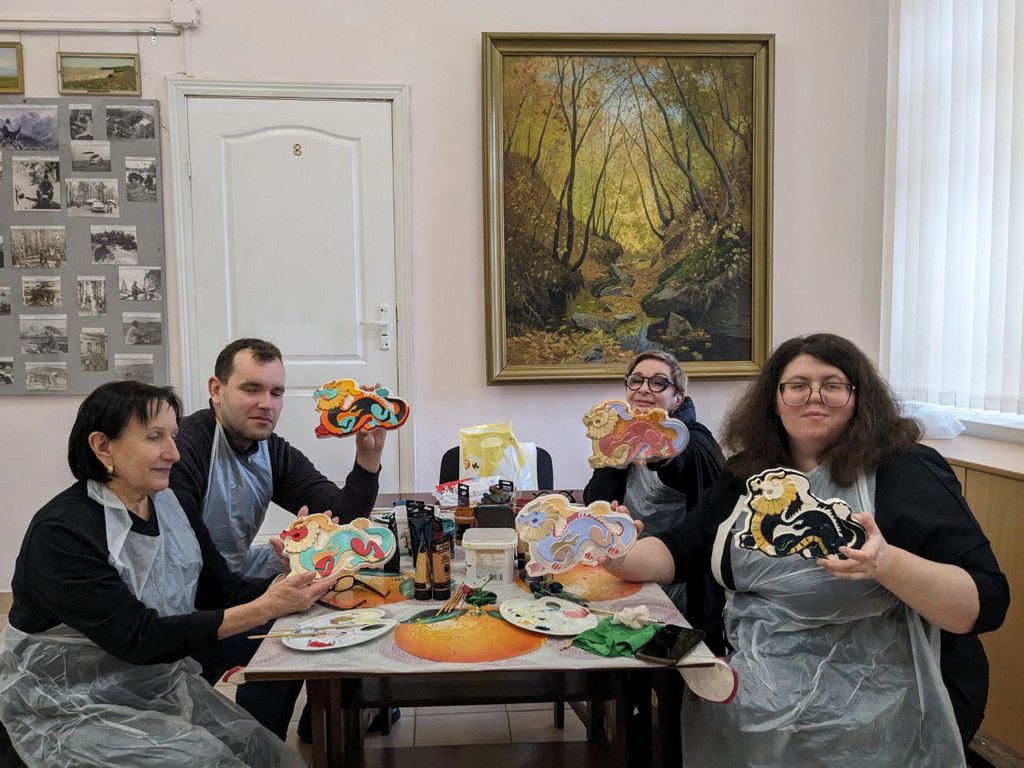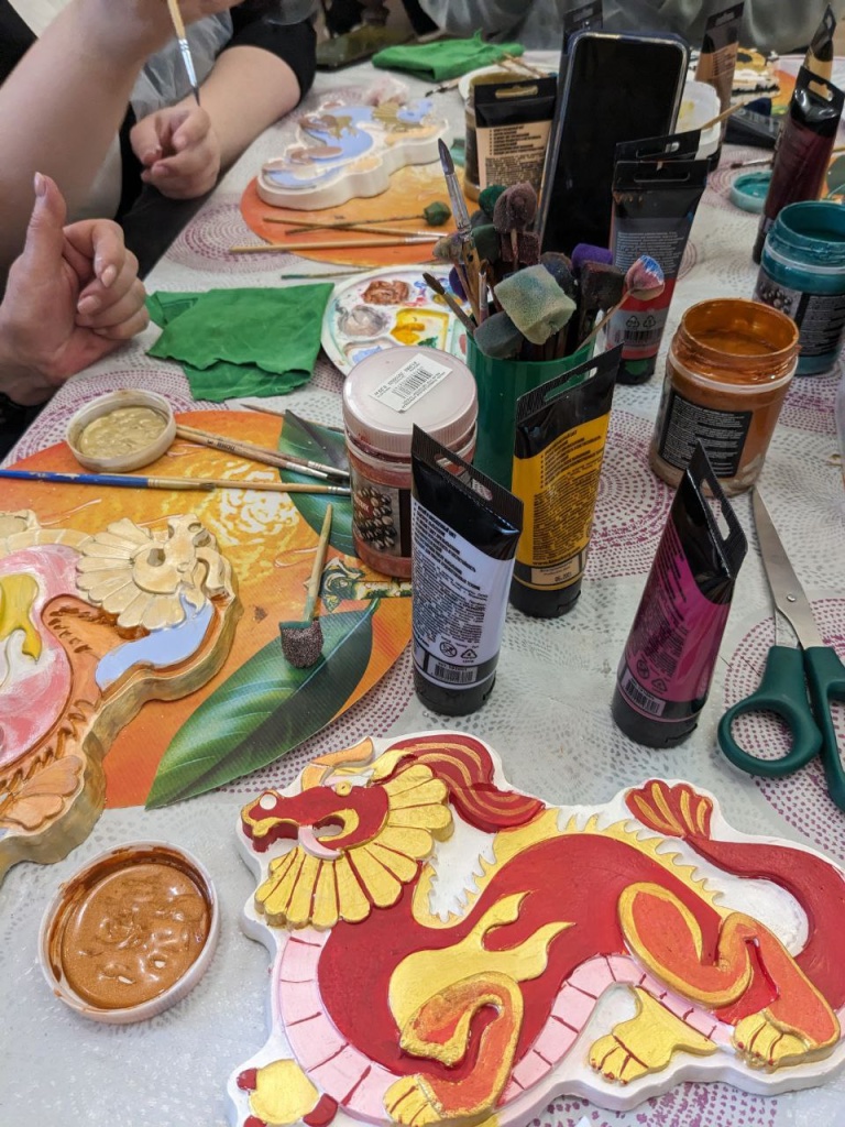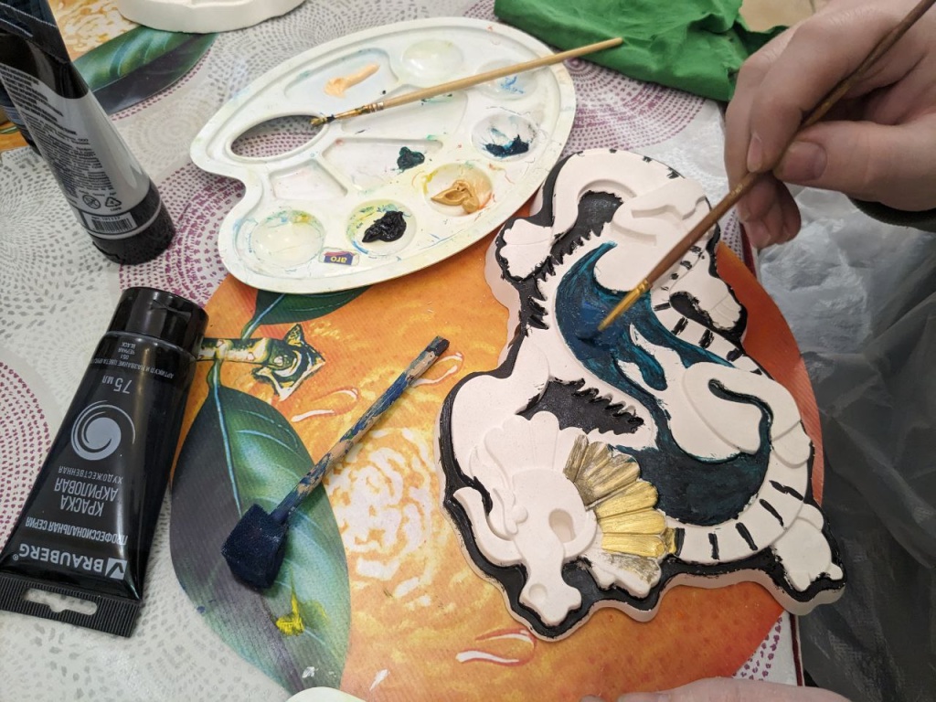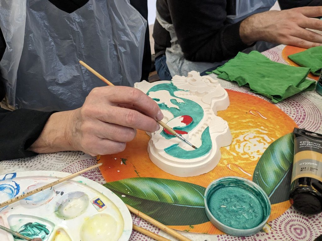 К празднику давний партнер и друг картинной галереи Анжелика Сергеевна Ткаченко, педагог-психолог Центра социально-трудовых компетенций на базе ГБОУ «Центр психолого-педагогической реабилитации и коррекции» г. Михайловска, подготовила для сотрудников галереи мастер-класс по росписи гипсовой фигурки дракона.