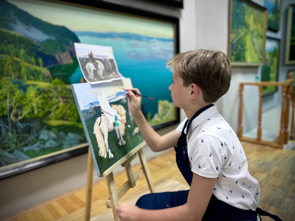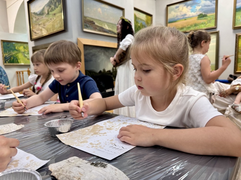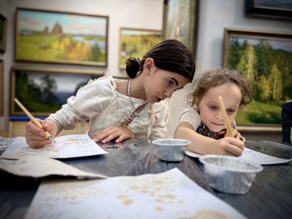 На заседании клуба ребята попробовали себя в написании кириллицы пером на состаренной бумаге, послушали игру на гуслях и создали свою картину по мотивам шедевров Васнецова.