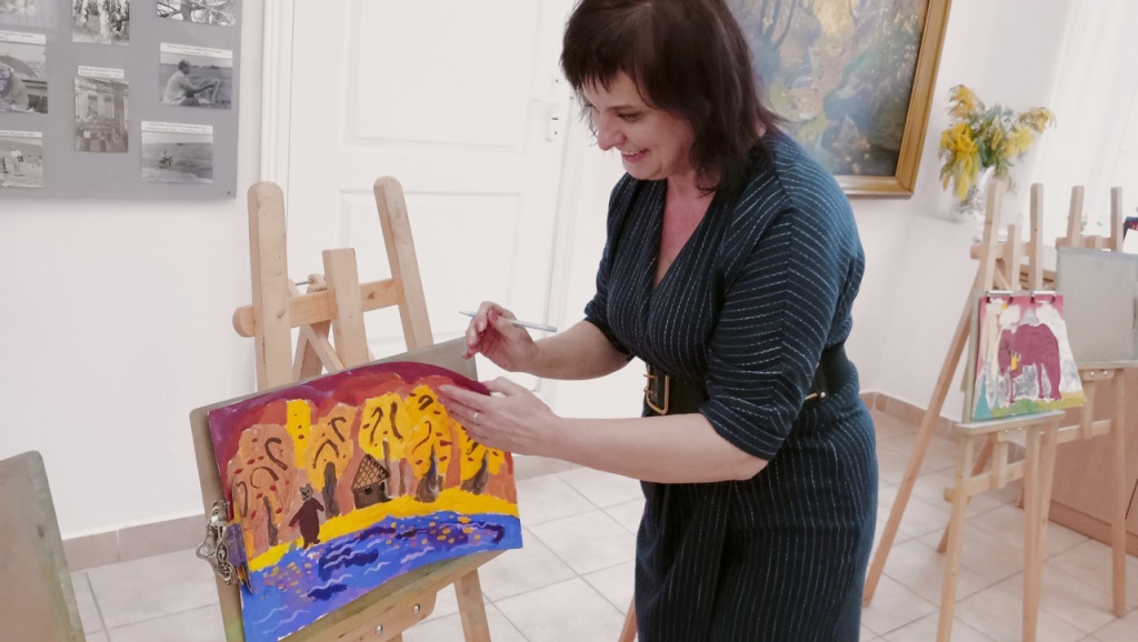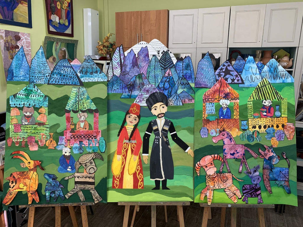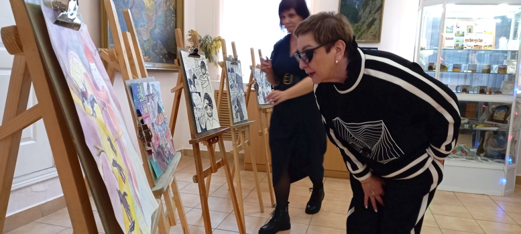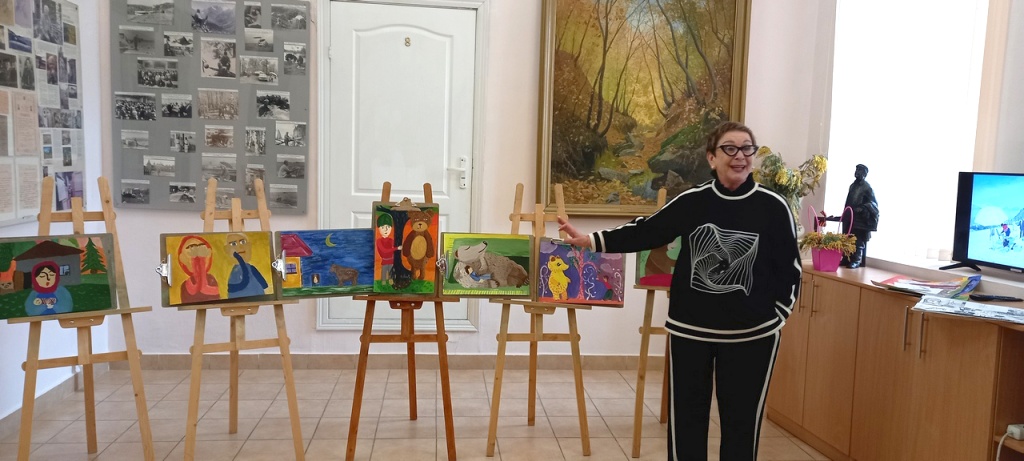 Преподаватель живописного отделения Детской школы искусств Болдырева Наталья Алексеевна представила вниманию Таисии Дмитриевны серию рисунков разных возрастных категорий. Темой этого года стали иллюстрации к сказкам народов Кавказа.