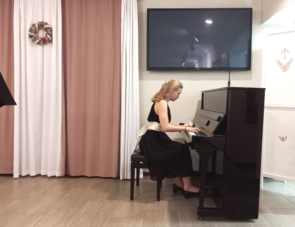 Камерный концерт открыла классическая фортепианная музыка. В исполнении учащейся 10 класса специальной музыкальной школы Санкт-Петербургской государственной консерватории им. Н.А. Римского-Корсакова Софьи Грищёвой прозвучали виртуозный «Концертный этюд № 2» Ференца Листа, романтичная «Баллада № 1» Фредерика Шопена, кокетливая и меланхоличная «Полька В.Р.» Сергея Рахманинова. Софья выступила также в качестве составителя текстов и ведущей концерта.