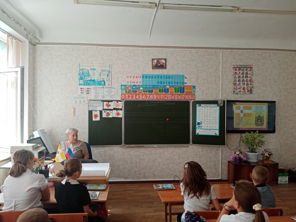 Заведующая филиалом Т.Н. Андрющенко представила тематическое слайд-шоу и рассказала об истории, географии и экономике Ставрополья. Она подробно описала геральдические символы – герб и флаг Ставропольского края. Белый цвет креста на прямоугольном полотнище отражает название Ставрополя – в переводе с греческого «город креста». Золотой цвет полотнища символизирует Ставрополье как солнечный южный регион России, край сельского хозяйства, золотого колоса и золотого руна.