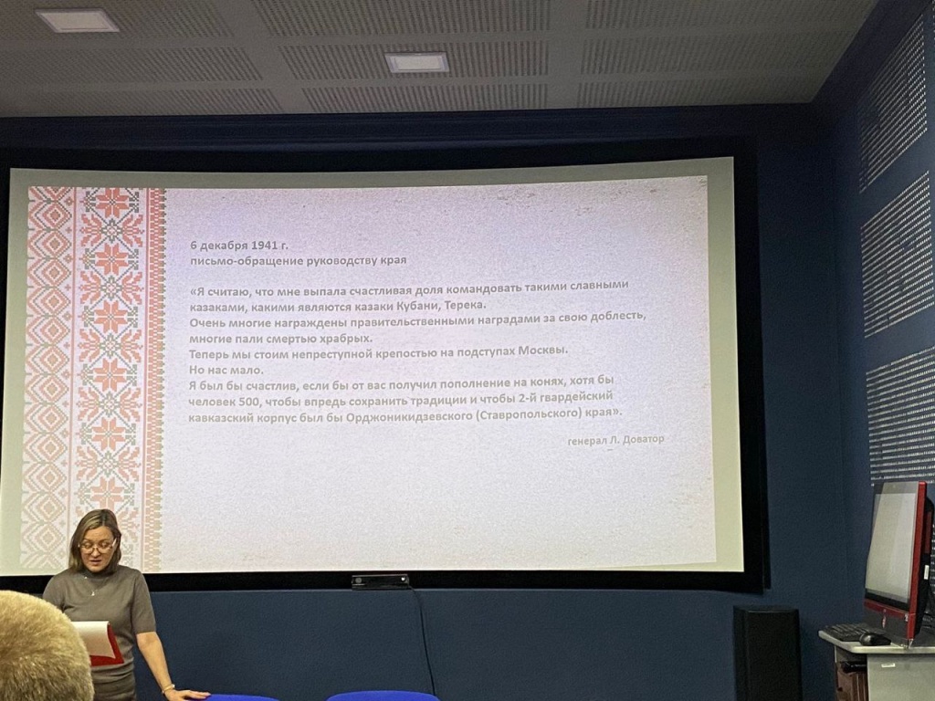 В истории казачества сохранилось много имен выдающихся казаков, атаманов, среди которых были как бунтовщики, так и герои. Без казачьих сабель не обошлась ни одна война России XVIII-XIX веков, они участвовали в покорении Кавказа, завоевании Средней Азии, освоении Сибири и Дальнего Востока. В Русско-японской войне 1904-1905 и в сражениях Первой мировой войны принимало участие более 300 тыс. казаков. Слушатели лектория узнали о казаках-героях Великой Отечественной войны, в том числе о генерал-майоре Льве Доваторе – одном из последних легендарных командиров в истории кавалерии.