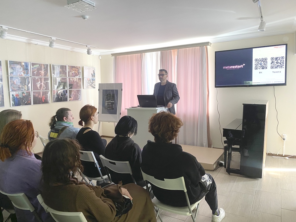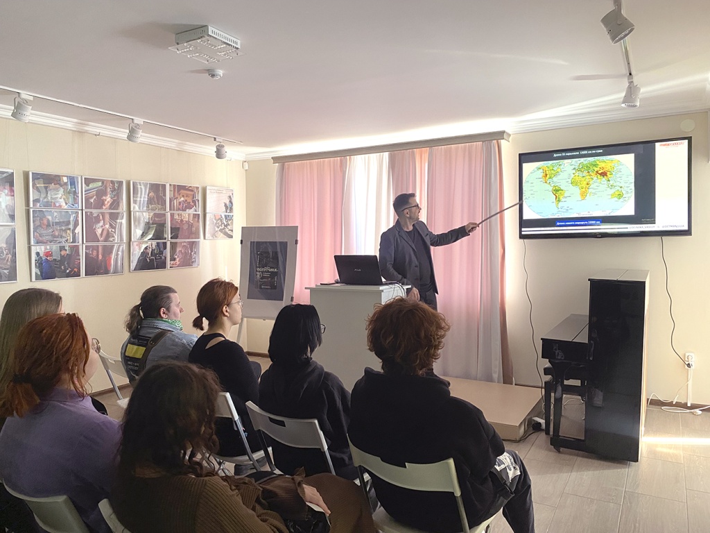 На базе выставки лекцию «Дневник в путешествии. Как вести тревел-блог?» для студентов колледжа «Современная школа бизнеса» провел фотохудожник, преподаватель специальных дисциплин, заместитель председателя Ставропольского отделения Союза Фотохудожников России Василий Дейнека. Василий много и успешно работает в жанре портрета. Его живописный язык – строгая геометричность или хаотичная заполненность пространства бликами, светом и тенями. Работы фотохудожника отличает множество живых моментов, большое количество деталей.