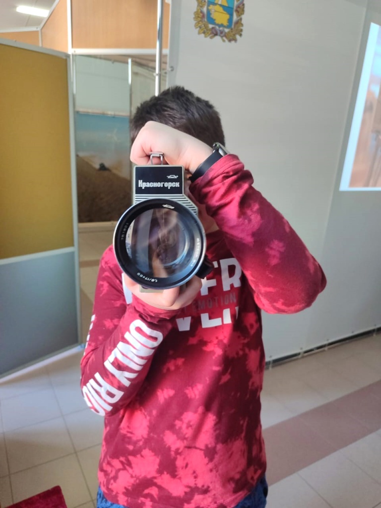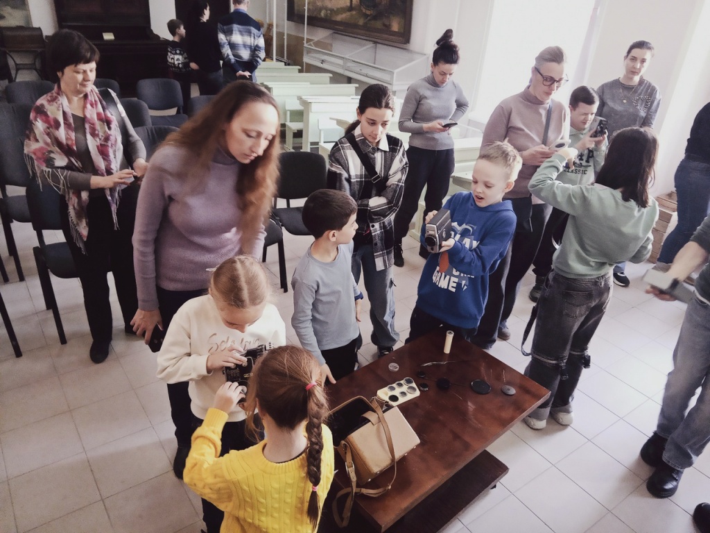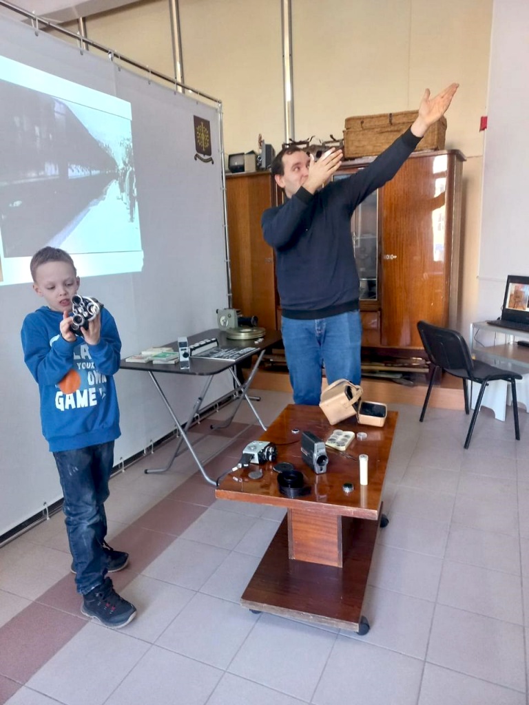 В ХХ в. кинокамеры стали меньше и доступнее. Именно такие и хранятся в фондах Ставропольского музея-заповедника. Среди них кинокамеры для съемки 8 мм фильмов «Нева», «Аврора-215», «Экран» и камера для 16 мм формата «Красногорск-2». Дети смогли приблизиться к миру старинной киносъемки и увидеть технику в действии. Они узнали о тонкостях работы с кинопленкой и смогли сфотографироваться с импровизированной «хлопушкой» для систематизации отснятых кинолент.