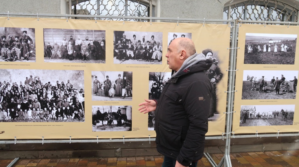 С содержанием выставки присутствующих познакомил заведующий отделом этнографии, кандидат исторических наук Андрей Борисович Гордиенко. Он рассказал об этноконфессиональном составе населения Ставропольской губернии в XIX в., проиллюстрировав свое повествование фотографиями кубанских и терских казаков, русских крестьян и горожан, представителей кочевого населения губернии: ногайцев, туркмен, калмыков, армян и греков, горских народностей Северного Кавказа: карачаевцев, черкесов, абазин, осетин, кабардинцев.