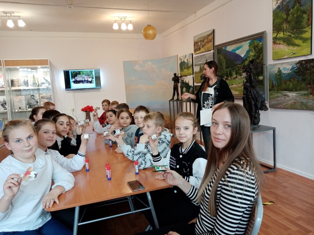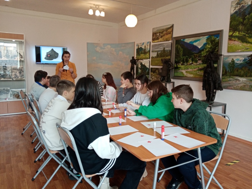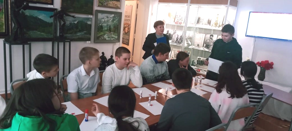 Сотрудники музея представили тематическое слайд-шоу и провели квест-игру. Школьники ответили на вопросы кроссворда и прочитали ключевое слово – Отечество. Ребята узнали, что житель Татарки, известный скульптор Георгий Прокофьевич Мясников, в прошлом был военным летчиком. Они выполнили модели самолётов в технике аппликации из цветной бумаги. Затем школьники решили продолжить работу в классе и создать инсталляцию эскадрильи из своих самолётов.