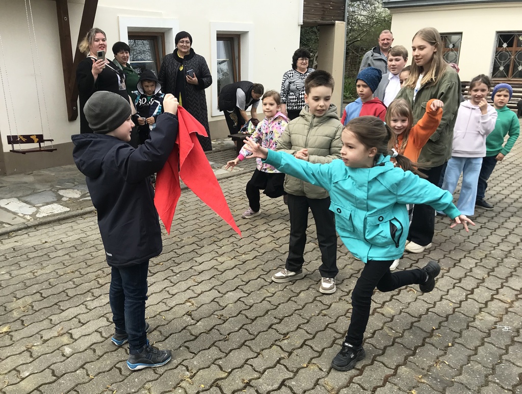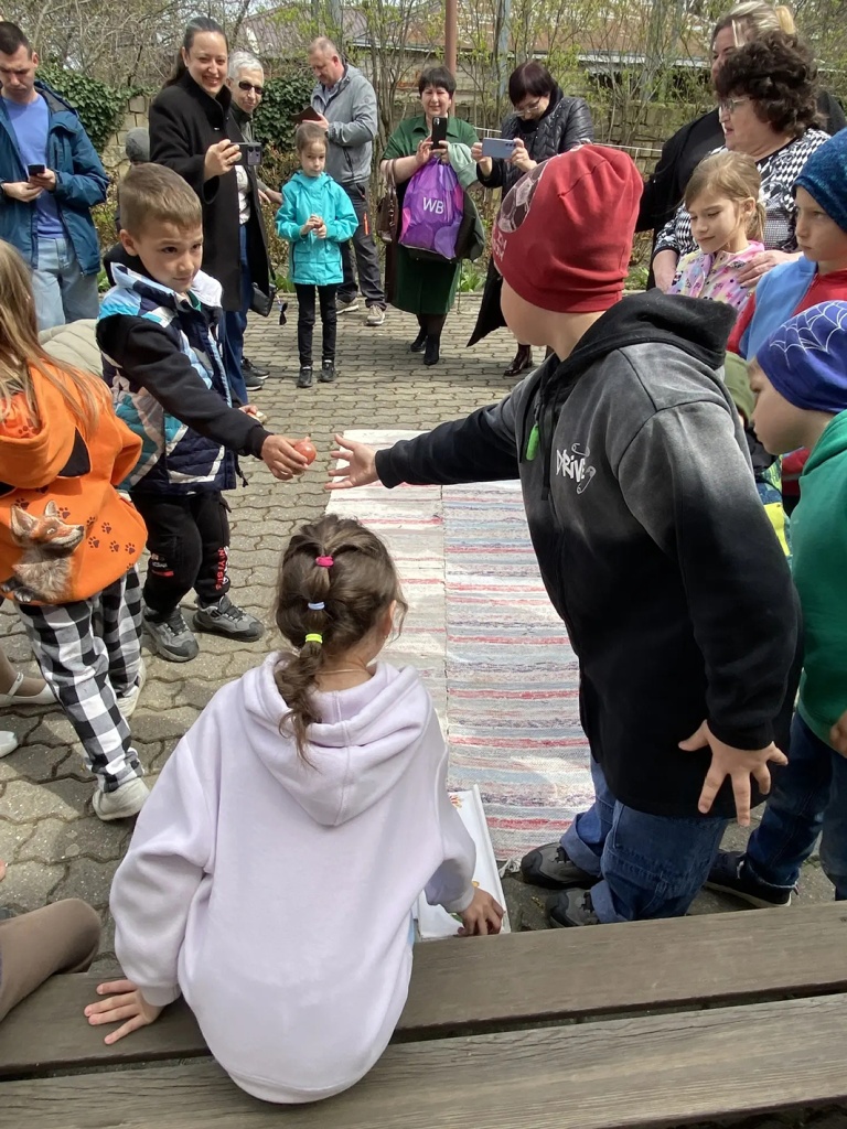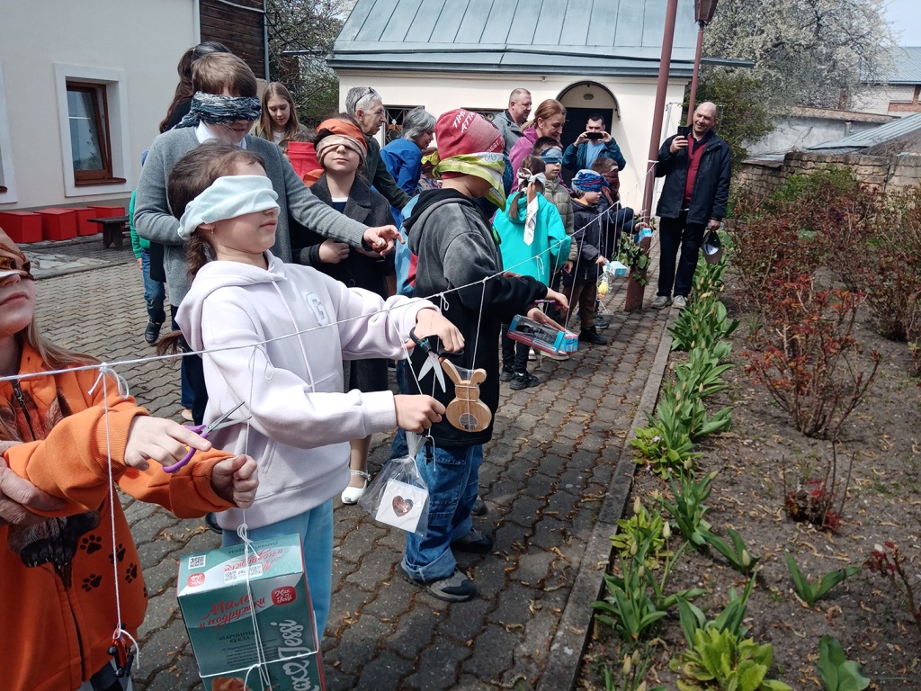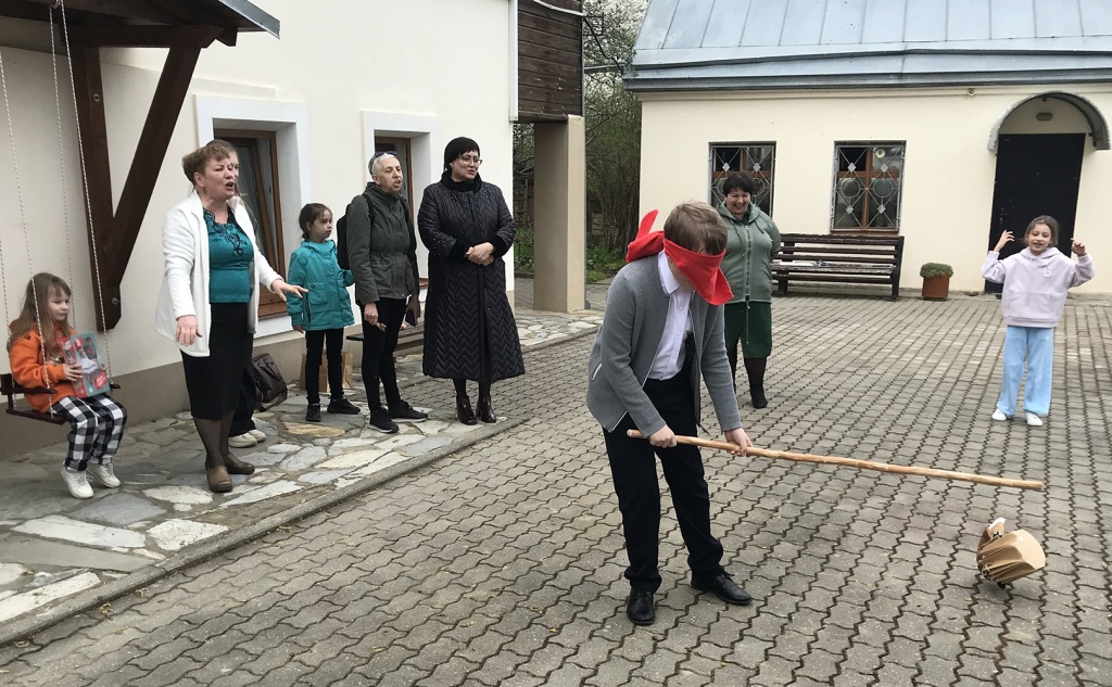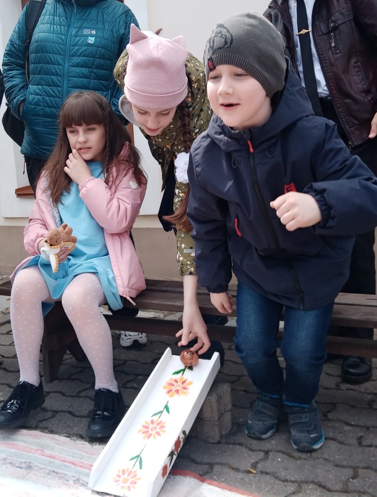 После концерта все вышли в цветущий сад и усадебный двор. Сотрудники музея раздали детям пасхальные яйца-писанки и предложили старинные забавы: битьё яиц, «каталочки» – катание яиц с горки, эстафету «пронеси яйцо на ложке». Волнение и радость испытали дети в игре «Срежь приз», когда с завязанными глазами срезали с ленты заветные призы – подарки от друга музея Анны Николаевны Бражниковой.