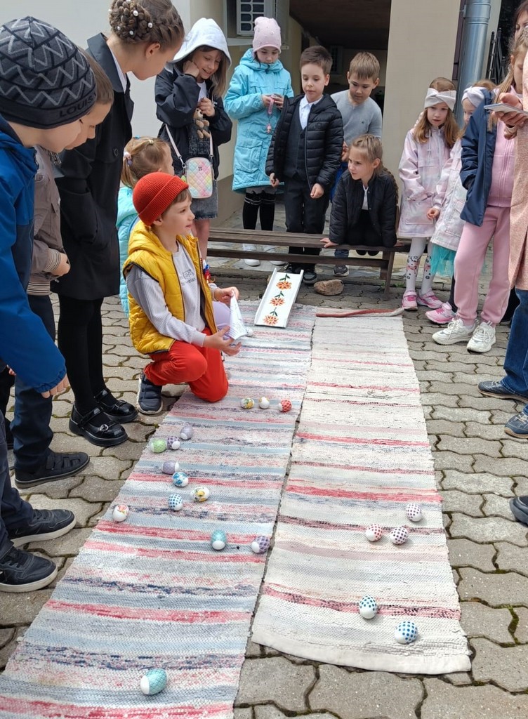 После концерта сотрудники музея организовали во дворе старинные пасхальные забавы. Разделившись на команды, ребята соревновались, кто быстрее донесет яйцо на ложке, и у кого дальше укатится яйцо по дощечке в игре «каталочки».