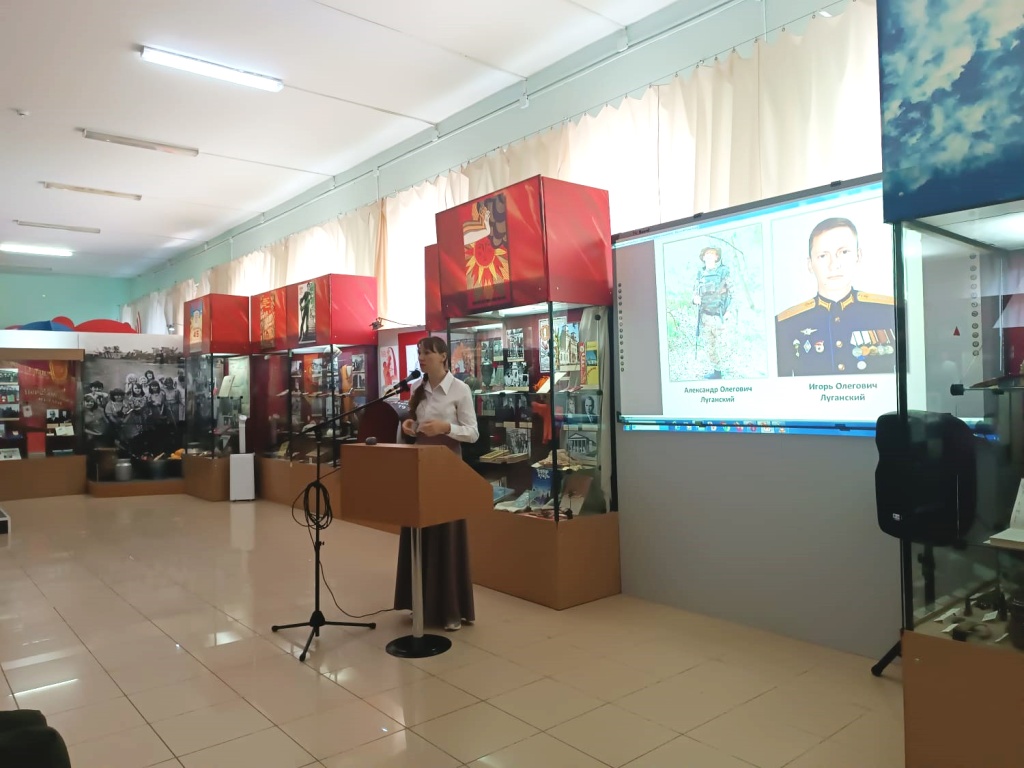 На мероприятие были приглашены участники специальной военной операции, сержант В.А. Каверин и рядовой И.В. Иванчихин. Ведущая мероприятия, старший научный сотрудник отдела истории А.С. Кудрина, рассказала об участии наших земляков из различных воинских частей в специальной военной операции.
