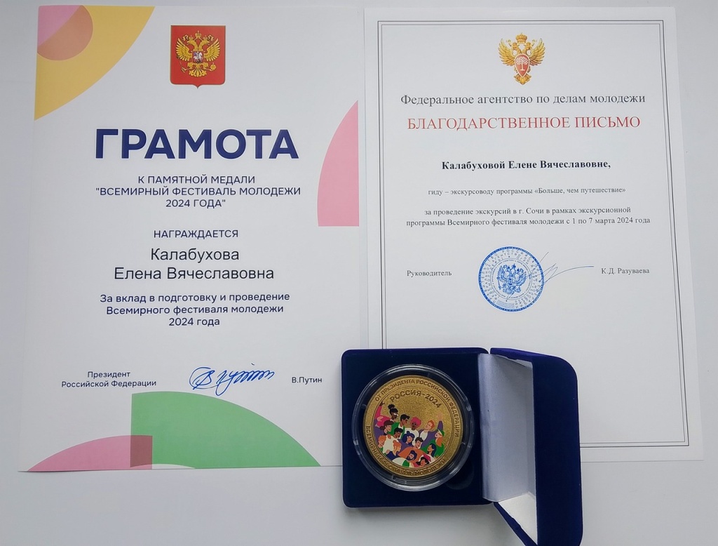 Владимир Владимирович Путин отметил важность мероприятий «Проводники смыслов» и наградил участников, памятной медалью Всемирного фестиваля молодежи. Это подчеркивает значимость ее работы и вклад в развитие культурного обмена и туризма в России.