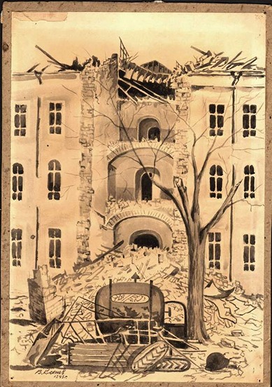 В.Г. Кленов Разрушенное здание школы на пр. Октябрьской революции (Бывшая Ольгинская гимназия) январь 1943 г.
