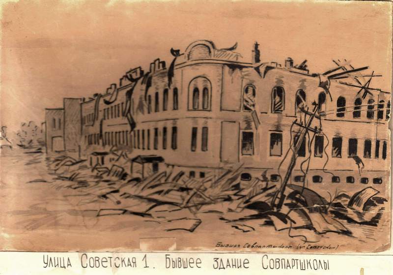 Художник В.Г. Клёнов через несколько дней после освобождения Ставрополя от фашистов в своих рисунках с документальной достоверностью запечатлел картину разрушений и ущерба, причиненного городу немецкими оккупантами: в руинах и пламени взорванные здания городской электростанции, краевого драмтеатра, магазина «Пассаж», педагогического института и другие.