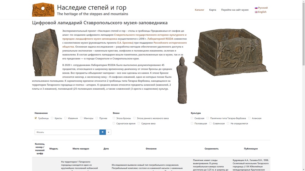 При поддержке фонда «История Отечества» создан первый в России виртуальный лапидарий — онлайн-выставка археологических предметов, выполненных из камня. Проект «Наследие степей и гор — стелы и гробницы Предкавказья от скифов до алан» стал финалистом конкурса по поддержке историко-просветительских онлайн-проектов.