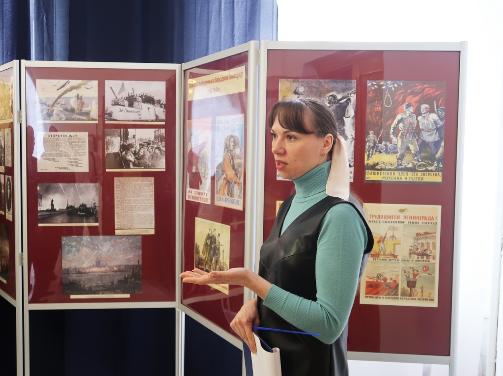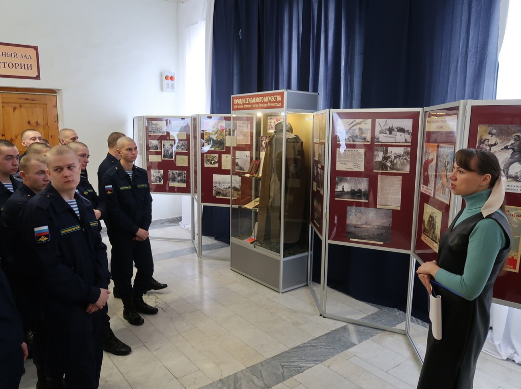 Затем участникам мероприятия была проведена экскурсия по выставке «Город несгибаемого мужества». В представленной экспозиции военнослужащие увидели военную форму, личные вещи, а также воспоминания «В четырнадцати километрах от Дворцовой площади» участника боев под Ленинградом Георгия Васильевича Орлова. На выставке посетители также увидели документы и фотографии Героя Советского Союза, командира 131-й стрелковой дивизии Петра Логвиновича Романенко, самодельный нож с процарапанной на ножнах памятной надписью, подаренный участнику прорыва блокады Ленинграда капитану Ивану Ивановичу Романову его боевыми товарищами, комплекс материалов о первоклассном лётчике Валерии Афанасьевиче Поскрякове.