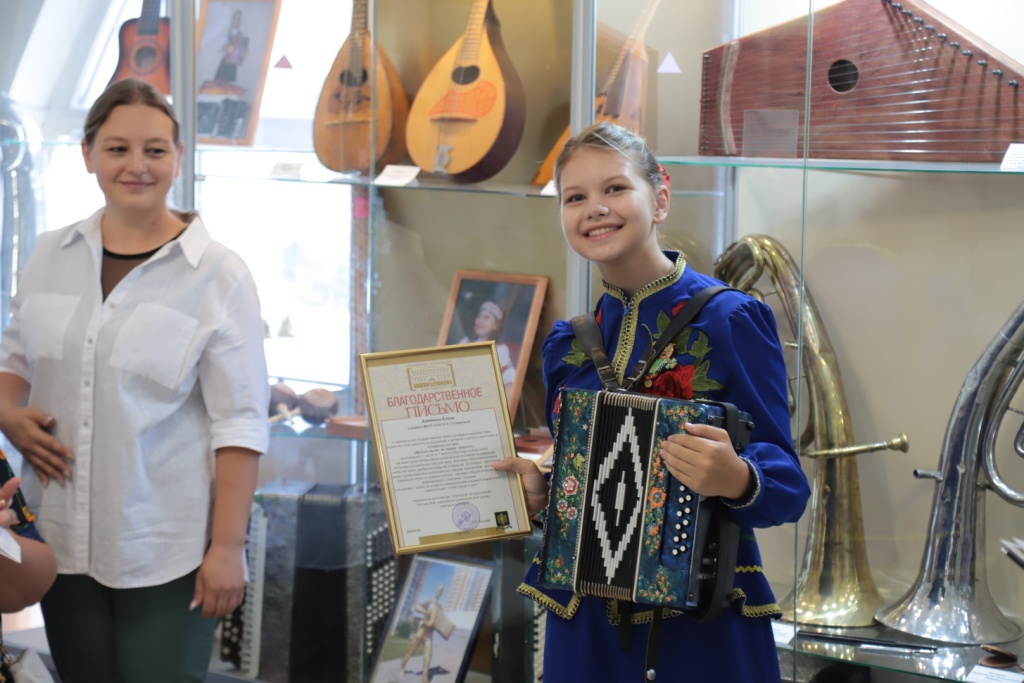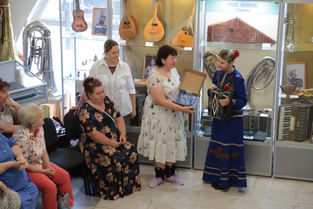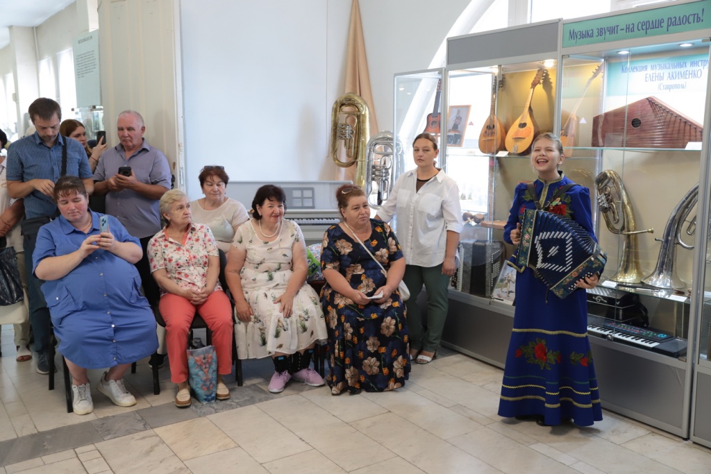 7 августа 2024 года в Ставропольском государственном музее-заповеднике состоялась творческая встреча с Еленой Акименко – талантливой ставропольчанкой, юным коллекционером музыкальных инструментов различных народов мира, играющей мастерски на гармони, гуслях, фортепиано, прекрасно исполняющей песни в разных жанрах и фланкирующей шашками и нагайками.