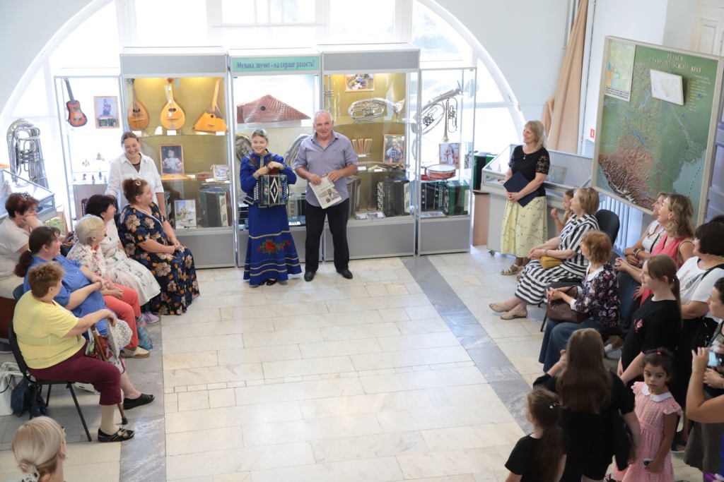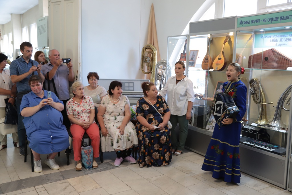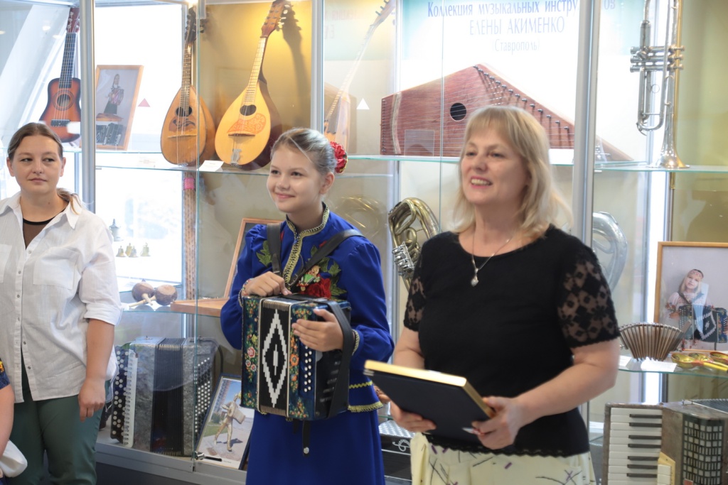 Встреча состоялась на базе выставки «Музыка звучит, на сердце – радость», где представлены более 80 музыкальных инструментов из частной коллекции Елены Акименко, учащейся 8 класса МБОУ СОШ № 4 города Ставрополя, участницы многочисленных Всероссийских и краевых музыкальных фестивалей и конкурсов.
