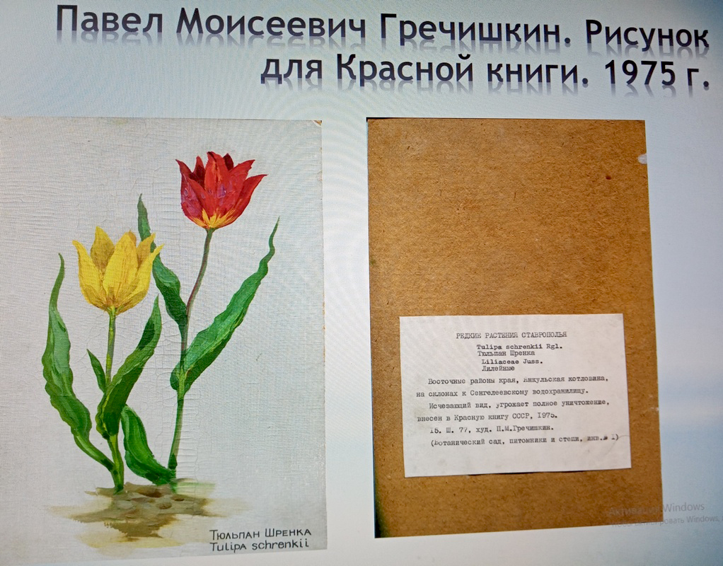 Сотрудники музея рассказали о заслуженном художнике РСФСР П.М. Гречишкине, который выполнил 300 рисунков редких и охраняемых растений края для книги «Сохраним для потомков». В 1975 году тюльпаны были отнесены к исчезающему виду, их можно было увидеть в восточных районах края, Янкульской котловине, около Сенгилеевского водохранилища.