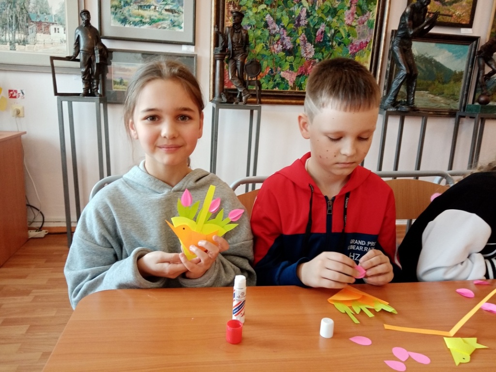 Ребята посмотрели слайд-шоу о дикорастущих и садовых тюльпанах и ответили на вопросы викторины. Они изготовили весеннюю открытку с букетом тюльпанов для мамы в технике объёмной аппликации. А затем из полоски бумаги сложили птичку в технике оригами.