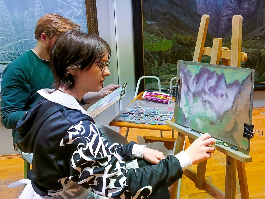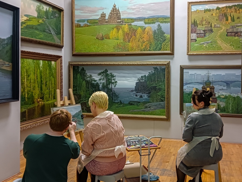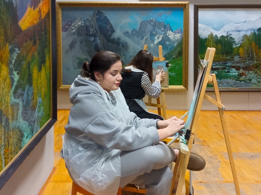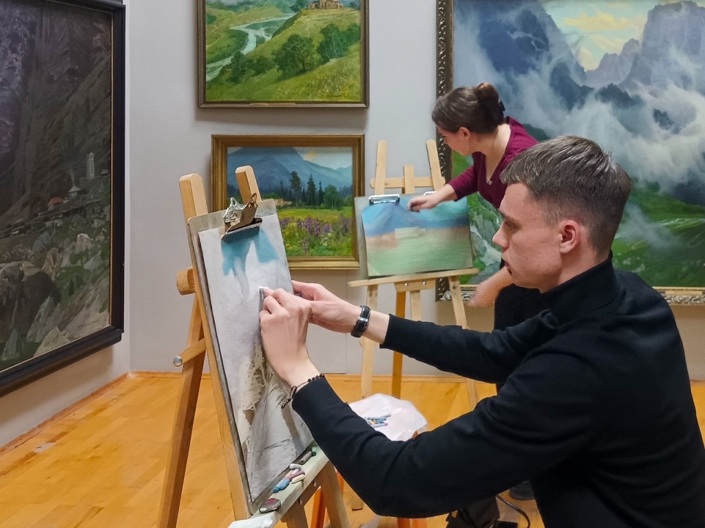 За мольбертом работает последний участник постоянных мастер-классов по живописи «На пленэр с Гречишкиным» Дарья, занятие проводит научный сотрудник Андрей Владимирович Шевцов. За минувший год в галерее прошло более 100 различных мастер-классов, позволивших владельцам Пушкинской карты и всем желающим выразить свои художественные способности.