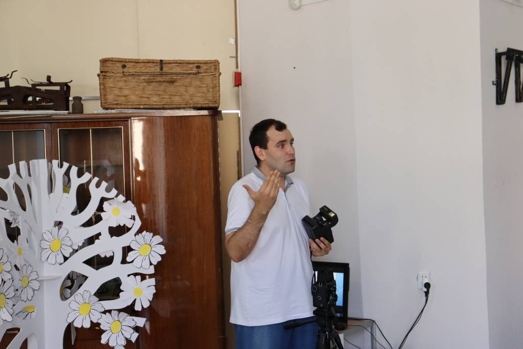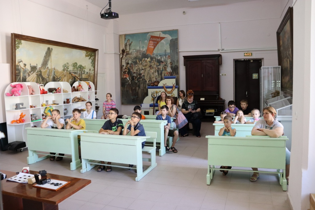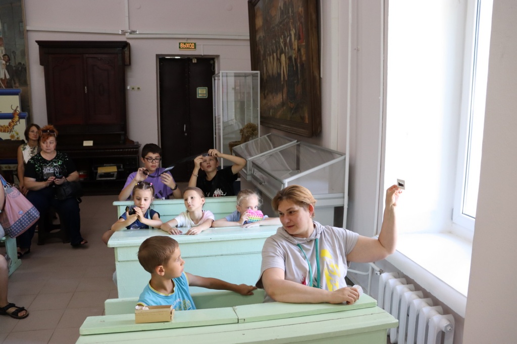 Участники культурно-образовательного проекта «Расту в музее» узнали о долгом пути фотографии от негатива на стеклянной пластине до цифрового снимка. Посетители увидели фотокамеры разных лет: мечту советских детей – фотоаппарат «Смена-8М», среднеформатную камеру «Любитель-166» и др. Проявленные пленки, слайдовые снимки, стеклянная фотопластинка 1940-х гг. и фотокарточка мгновенной фотопечати «Полароид» удивили юных посетителей. О процессе фотографирования, проявке и фотопечати, а также о непростом внутреннем устройстве фотоаппарата рассказал заведующий депозитарно-выставочным отделом Виктор Дмитриевич Бабенко.
