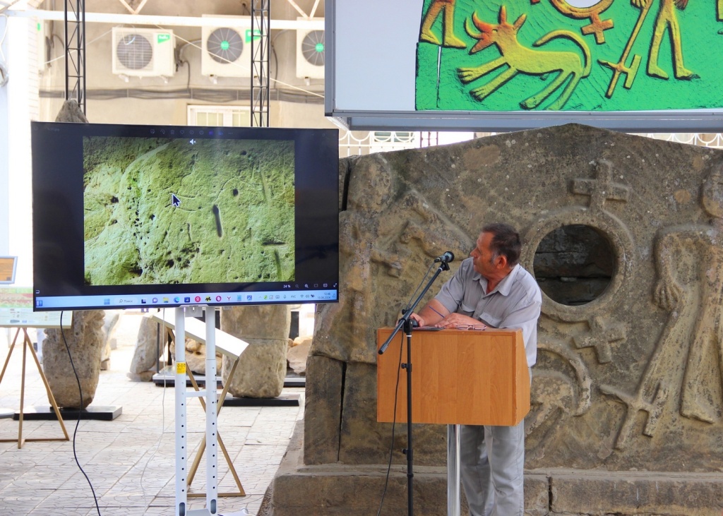 Доклад Н.А. Тихонова, ведущего научного сотрудника САО РАН, доктора физико-математических наук (п. Нижний Архыз, Карачаево-Черкесская Республика), посвящен исследованиям Т.М. Минаевой. Николай Александрович представил уточненные и дополненные результаты к исследованиям Т.М. Минаевой по могильникам «Токмак-Кая» и «Балка Крейда» в 1950-х – 1960-х гг. За прошедшие десятилетия появились новые методы и результаты фиксации данных. В катакомбе могильника «Токмак-Кая» получены снимки свода камеры, что позволило найти новые, малозаметные тамги, а также внести некоторые исправления в известные ранее изображения. Кроме того, в окрестностях могильника выявлены неизвестные ранее кольцевые структуры. Для некоторых погребений могильника «Токмак-Кая» получены снимки с петроглифами на сводах камер. Можно отметить существование поселения кобано-сарматского времени менее чем в километре от балки с тамгами, что также не было известно Татьяне Минаевой.