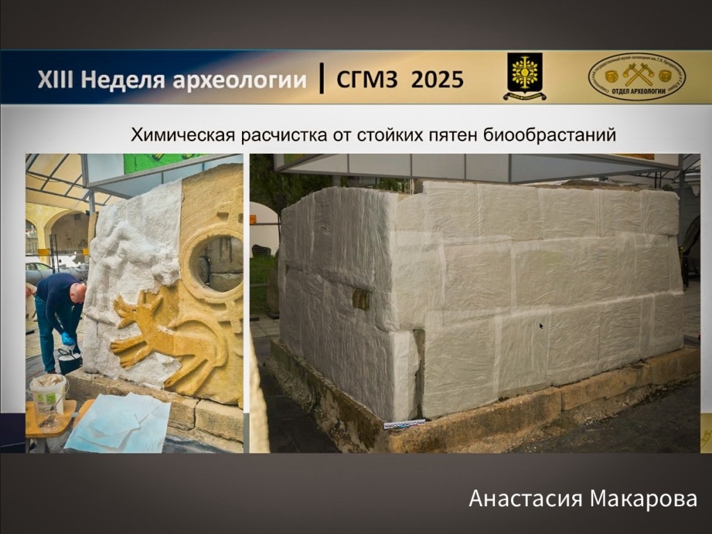 Ученый секретарь ФГБНИУ «ГОСНИИР», художественный реставратор II категории, кандидат культурологии А.С. Макарова выступила онлайн с отчетом о реставрационных работах мавзолея аланского правителя, которые были произведены в 2024-2025 гг. В их числе: взятие и изучение проб и образцов, план работ, очистка, биоцидная обработка, укрепление отслоений, мастиковка межблочных швов и многое другое.
