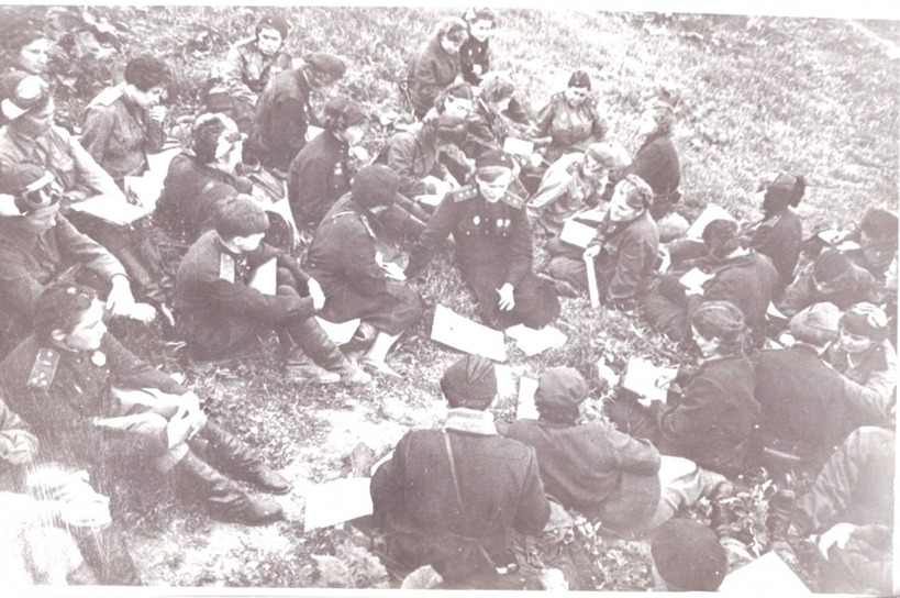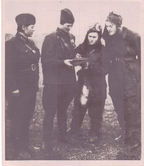 Бершанская Е.Д. (в центре) и комиссар полка Рачкевич (первая слева) дают очередное задание летчицам полка осень 1942 года.