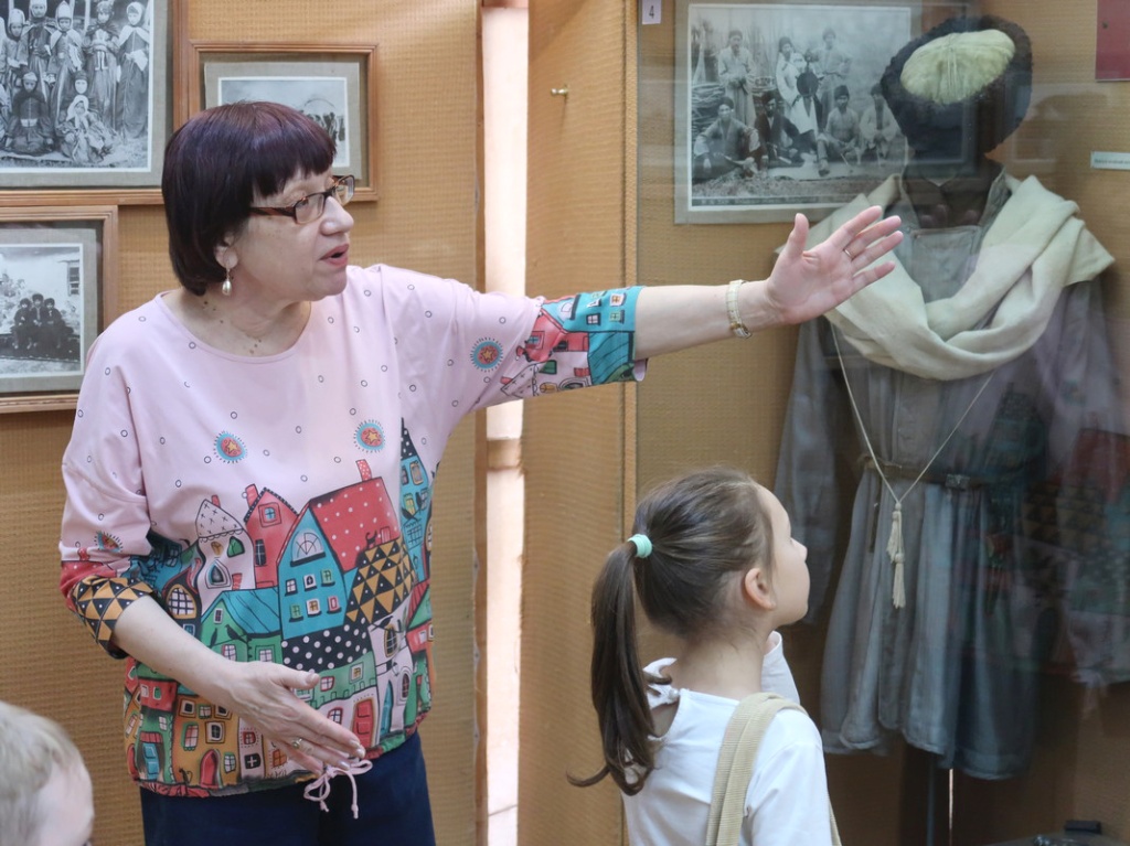 Старший научный сотрудник отдела этнографии Ирина Михайловна Назарова познакомила ребят с разнообразием национальных костюмов, но особое внимание удела именно традиционной женской одежде. Ведь красота женского костюма народов Кавказа состоит из множества необычных и интересных элементов. Ребята рассмотрели особенности швов, оформления и вышивки женских нарядов.