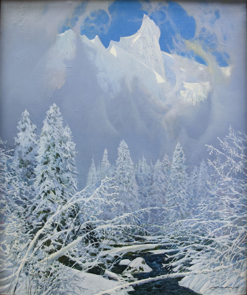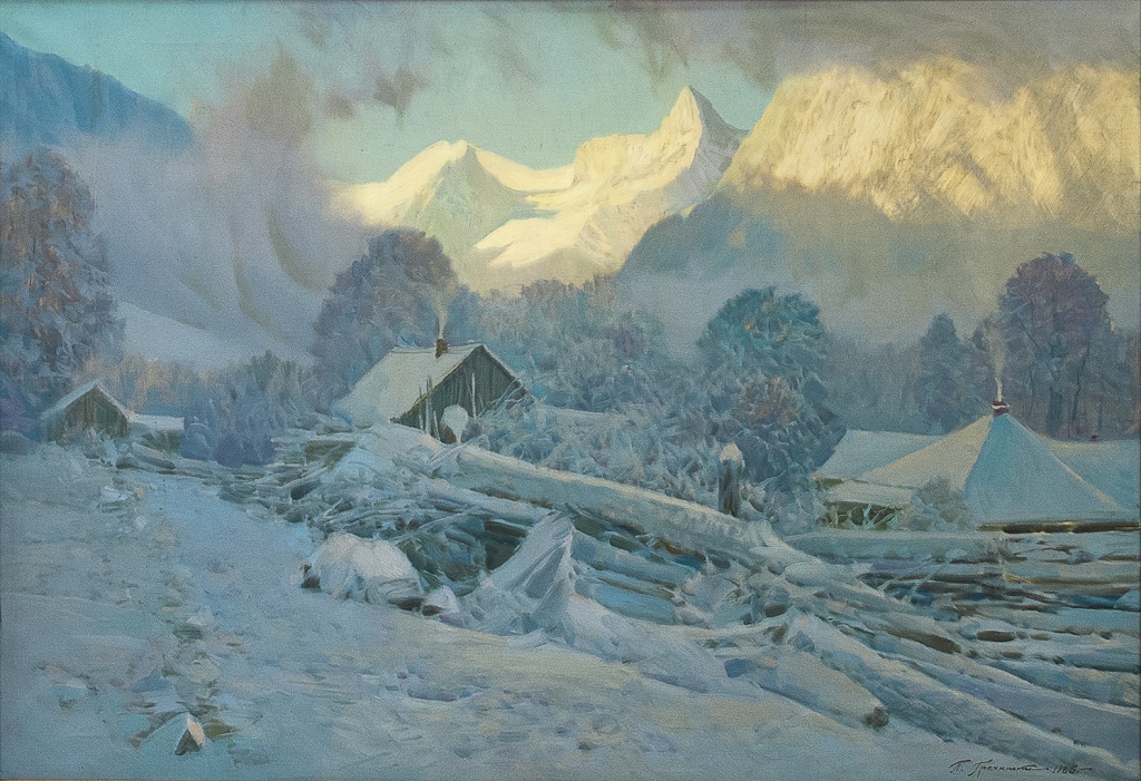 Зимний сезон – редкий гость в творчестве пейзажистов: суровость пленэрной работы на морозе и колористическая сложность в передаче настроения и состояний природы негласно ставят зиму в цикл наиболее редких тем, что особенно отражается в творчестве Гречишкина, которого часто называют «художником осени». Всего в запасниках картинной галереи хранится 16 живописных произведений, посвященных этому времени года. Картина «Домбайская фантазия» 1990 года – самый известный зимний пейзаж Гречишкина, представленный в постоянной экспозиции картинной галереи с момента его написания.