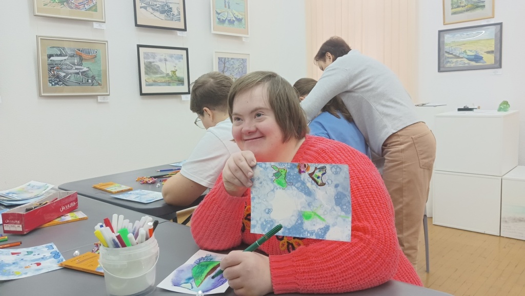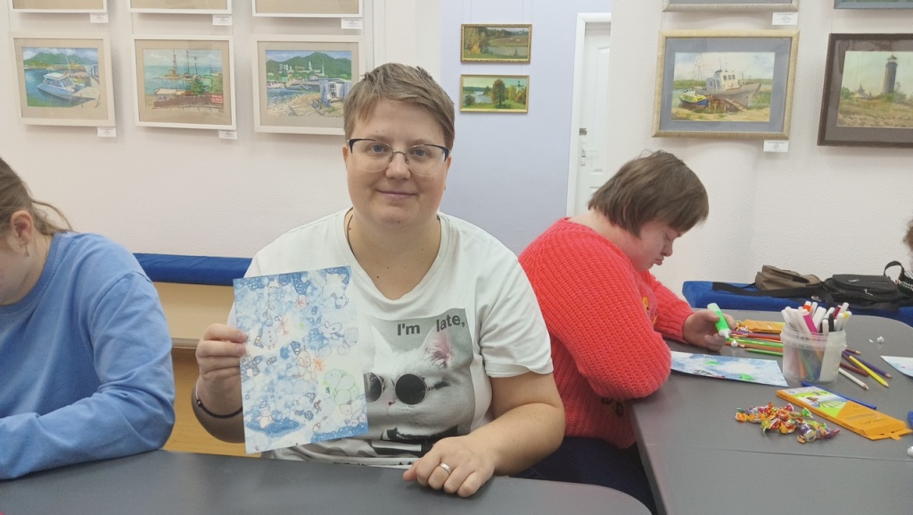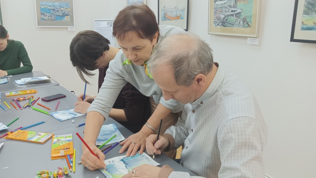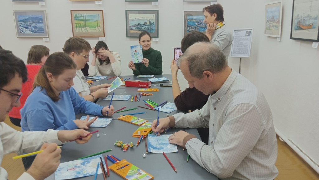 Марина Ивановна рассказала зрителям и о своих произведениях, а также предложила внести оттенки приближающегося Нового года в творческую работу. С помощью заранее подготовленных монотипий экскурсанты прилежно работали над своими собственными иллюстрациями на тему зимы. Интересная техника позволила художникам поэкспериментировать со средствами художественной выразительности и проявить свои творческие способности под чутким руководством профессионального художника и педагога М.И. Черниговской.