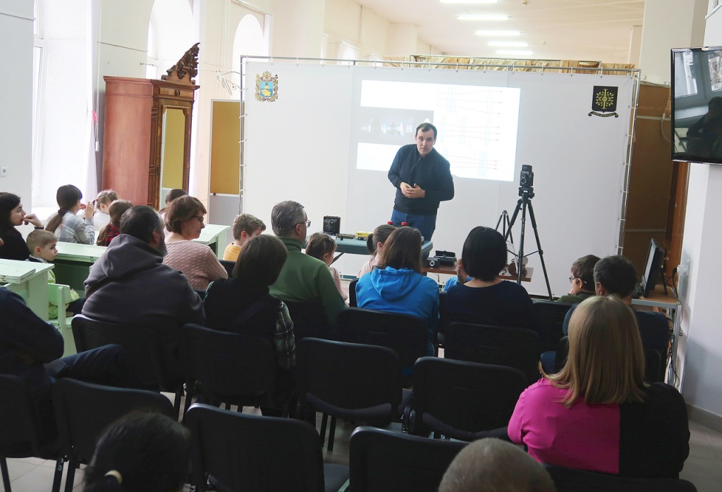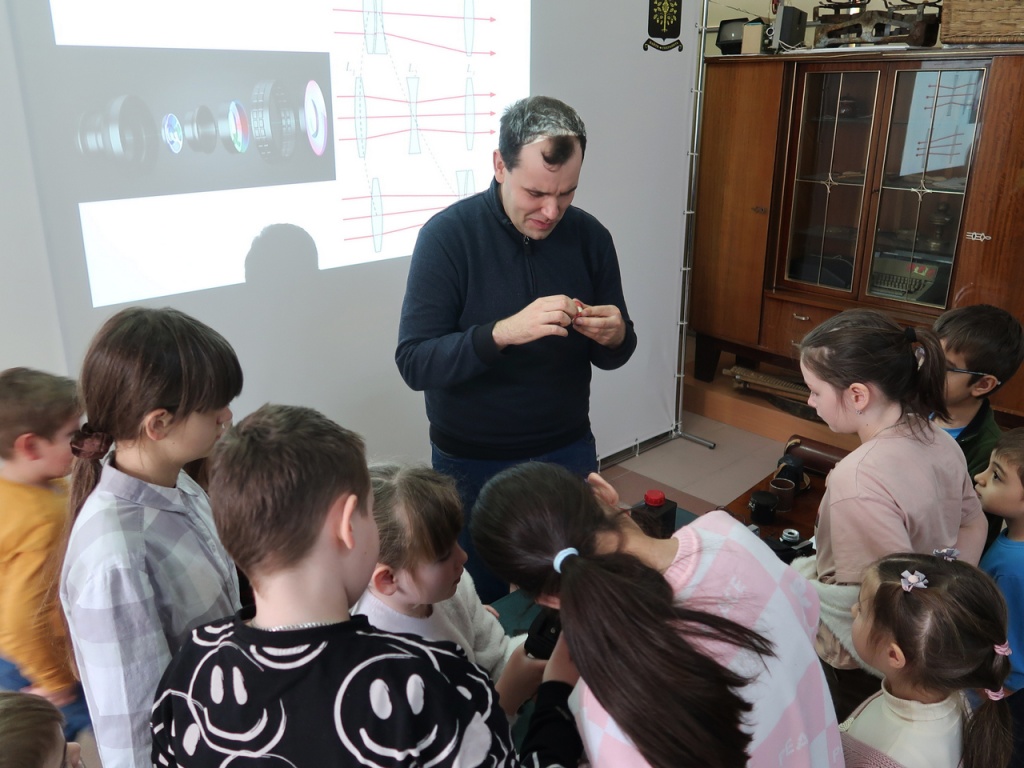 Экскурсию провел заведующий депозитарно-выставочным отделом Виктор Дмитриевич Бабенко. Он рассказал посетителям об истории самой важной части любого фотоаппарата – объектива, история которого началась задолго до изобретения фотосъемки. Прародителем объектива была подзорная труба, с помощью которой мореплаватели ориентировались в океане и открывали новые земли. В XIX веке объектив стал частью не только фотокамер, но и киноаппаратов. Образцы объективов для советских и иностранных фотоаппаратов хранятся в фондах музея, несколько из них были показаны посетителям.