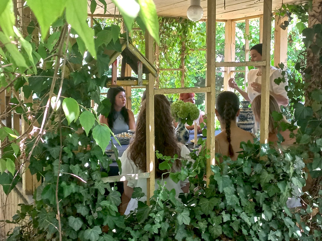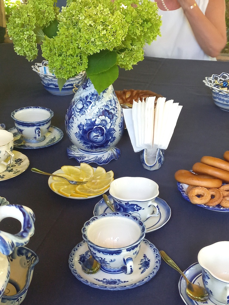 Ценности традиционного дореволюционного общества не устарели, они востребованы и сейчас. После экскурсии участники встречи собрались в беседке, скрытой среди зелени в глубине сада. На столе – сервиз и самовар ручной гжельской росписи, все гости в белом или синем, а чай и угощения – настоящие и самые разнообразные.