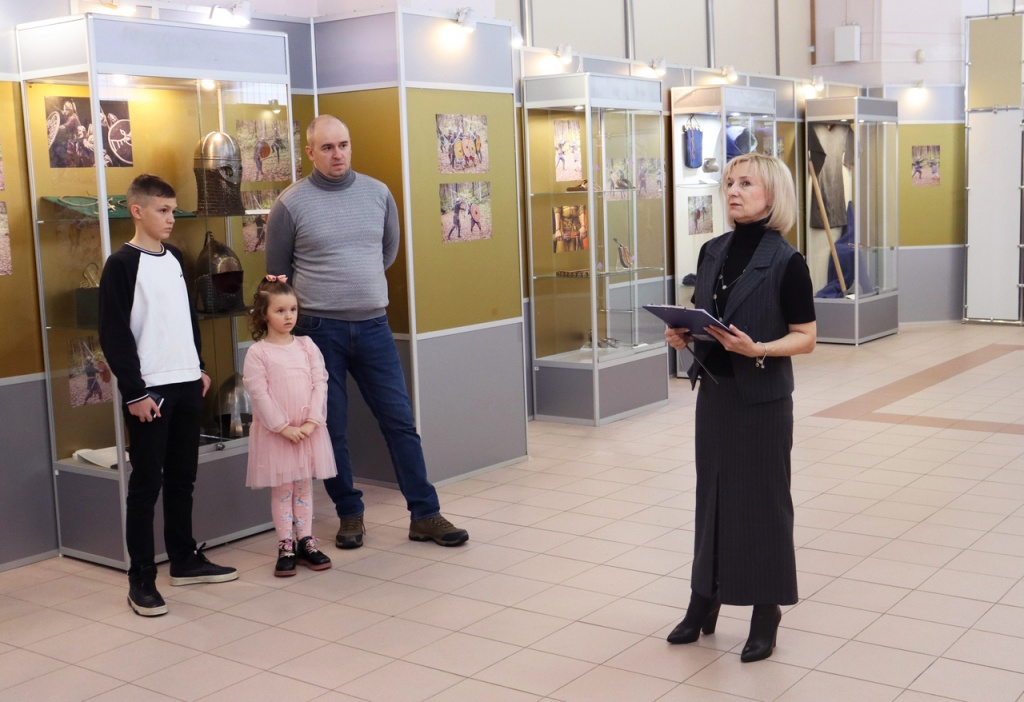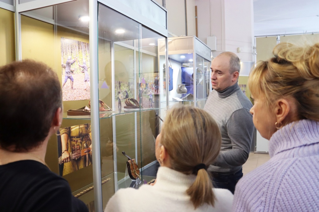 О.А. Остапенко познакомил гостей и сотрудников музея с представленными на выставке экспонатами-новоделами, выполненными методом реконструирования: мужскими и детскими костюмными комплексами, разнообразными аксессуарами, оружием, украшениями, предметами быта.